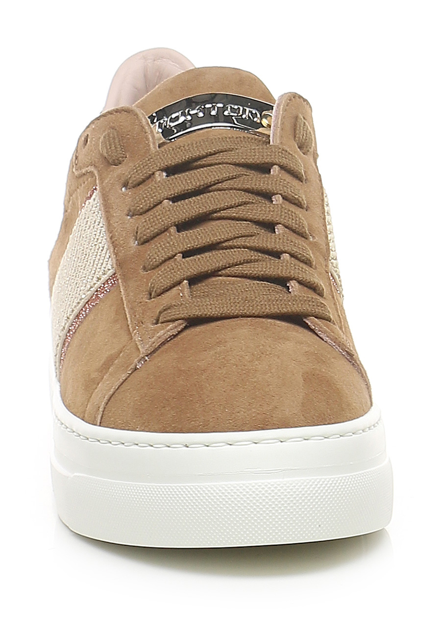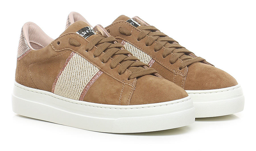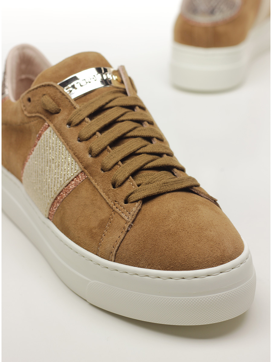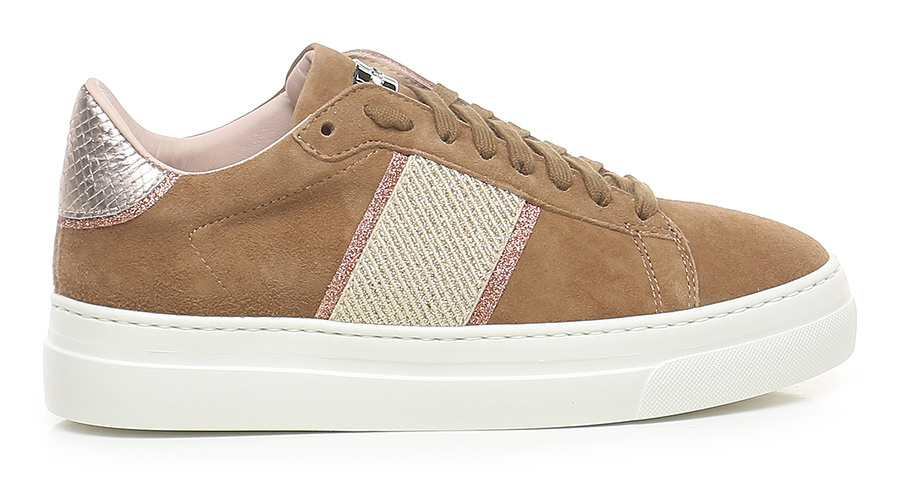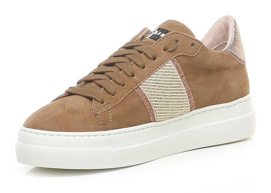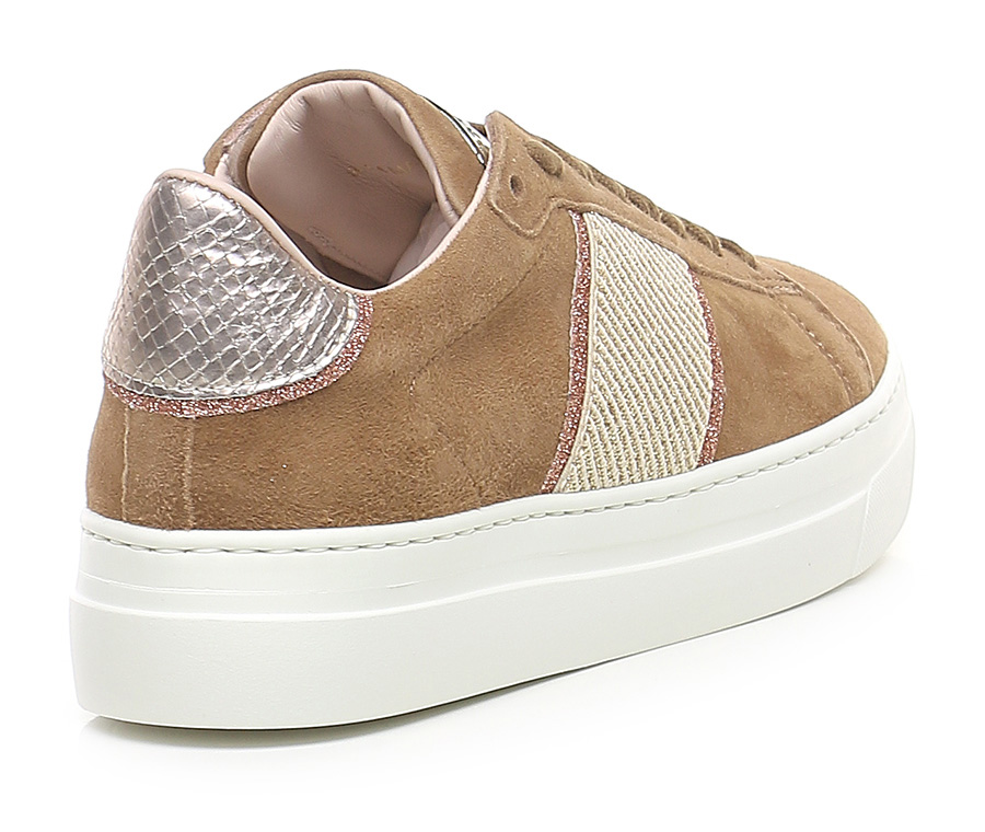 Sneaker in camoscio e tessuto con inserti in glitter e talloncino in pelle laminata stampa pitone. Suola in gomma. Altezza tacco 35mm, platform 30mm con battuta 5mm.