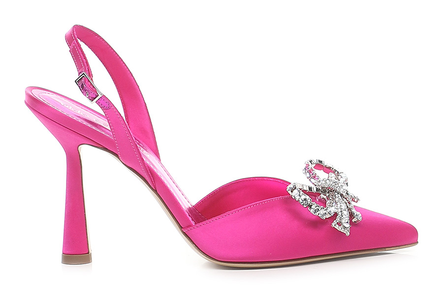 Satinschuh mit Riemen auf der Rückseite. Schleifenzubehör mit Strasssteinen vorne. Sohle aus Leder und Gummi. 100mm Absatz.
