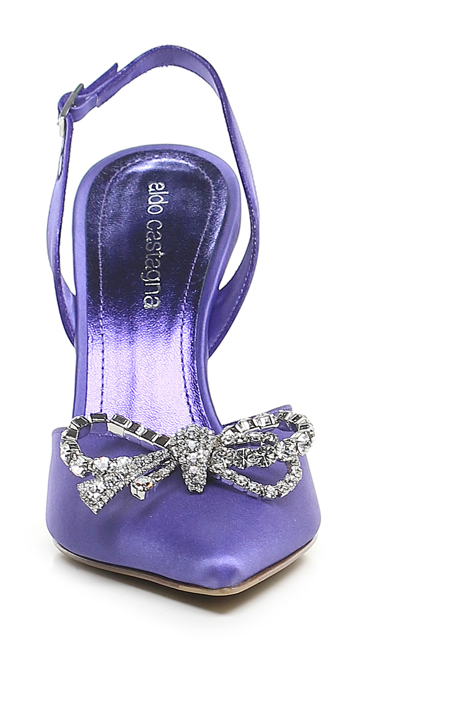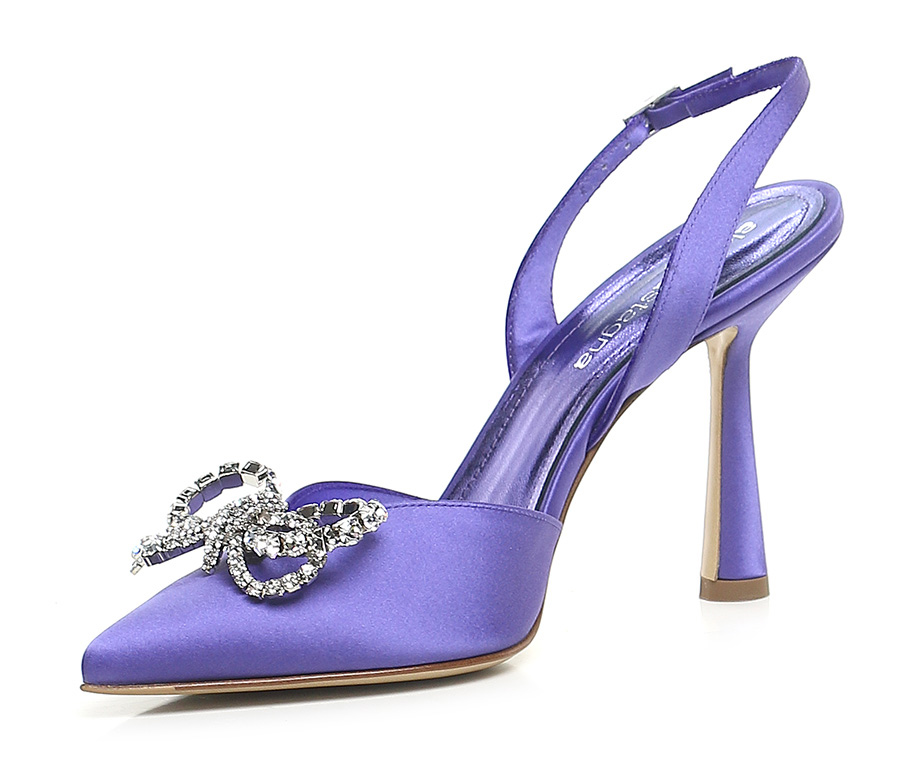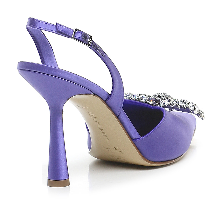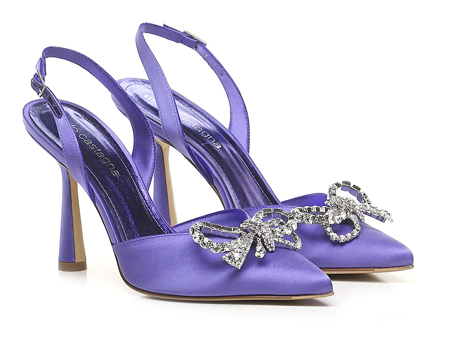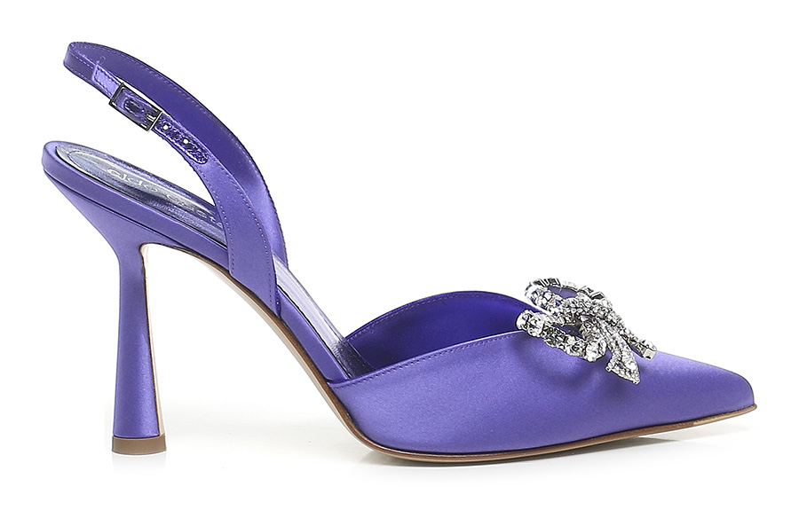Satinschuh mit Riemen auf der Rückseite. Schleifenzubehör mit Strasssteinen vorne. Sohle aus Leder und Gummi. 100mm Absatz.
