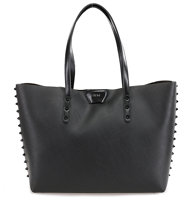 Borsa in lattice lavorato con chiusura a gancio e borchie silver. Pochette interna in tessuto tecnico inclusa. Misure 36 x 28 cm.