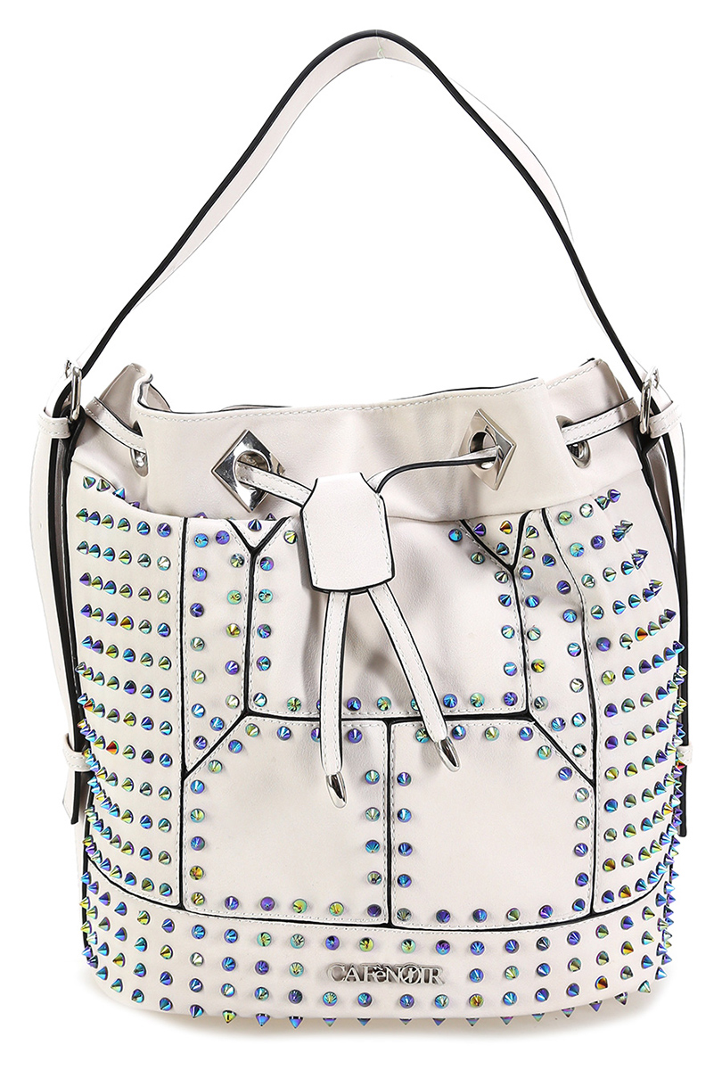 Borsa in eco pelle con bottone magnetico di chiusura. Borchie applicate. Misure 29 x 29 cm. Dettagli silver.