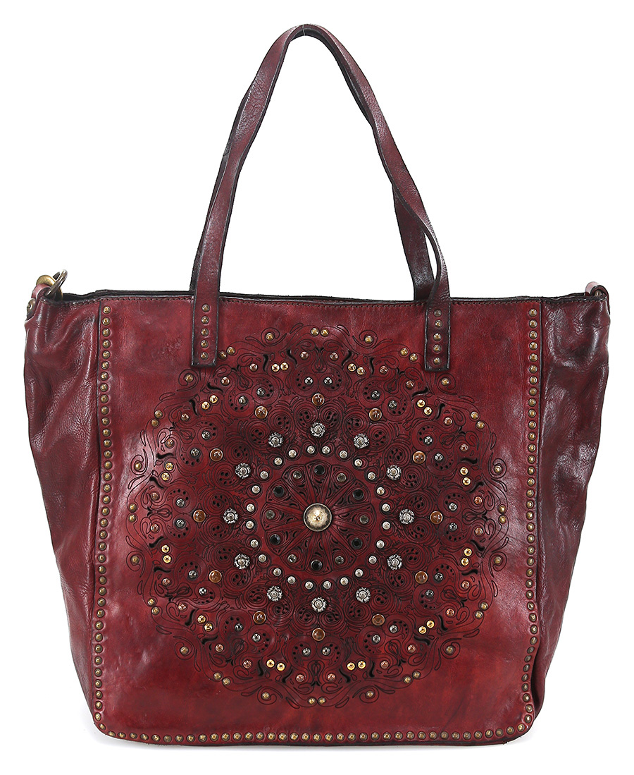 Borsa in pelle con decorazione laserata e applicazione di rivetti e strass, chiusura a zip e tracolla inclusa. Misure 32 x 32 cm.