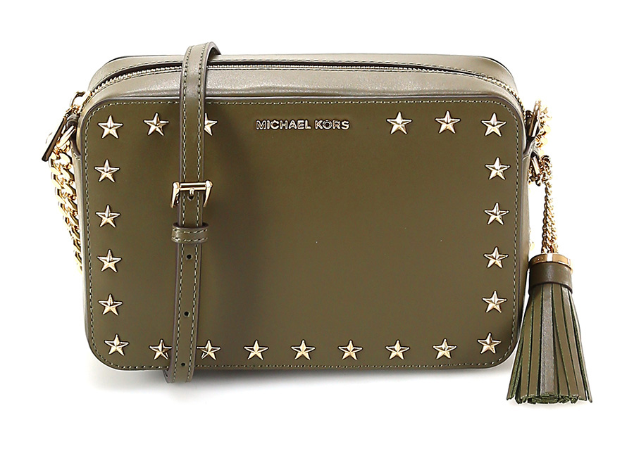 Borsa in pelle con stelle metalliche lungo i lati, chiusura a zip, nappina laterale e tracolla a catena e pelle regolabile. Misure 21,5 x 14,5 cm.