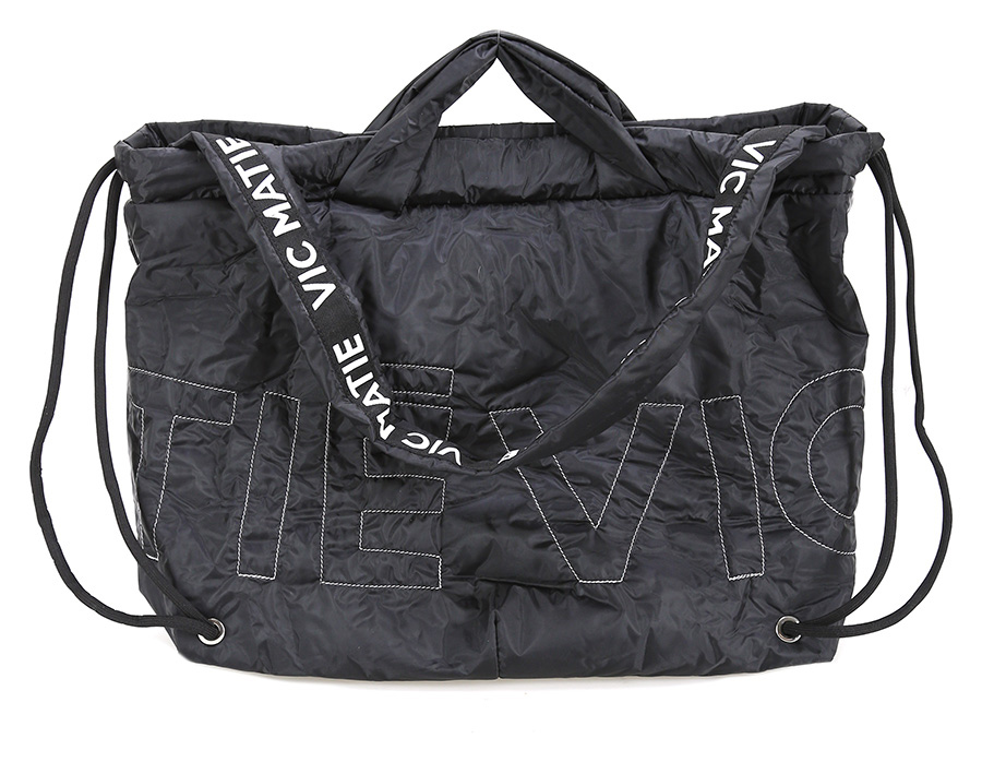 Borsa in nylon con bottoni di chiusura. Tasca interna nella quale si può inserire la borsa per utilizzarla come zaino. Tracolla inclusa. Misure 50 x 45 cm. Dettagli silver.