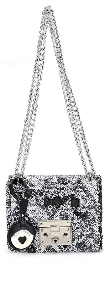 Borsa in tessuto decorata con paillette, gancio di chiusura e tracolla a catena. Misure 18x15 cm.