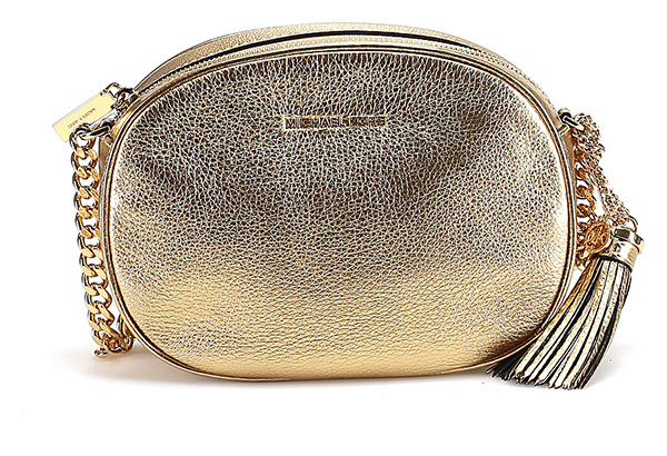 Borsa in pelle martellata con nappina e tracolla a catena. Tasca posteriore a filetto. Misure 20x16 cm.