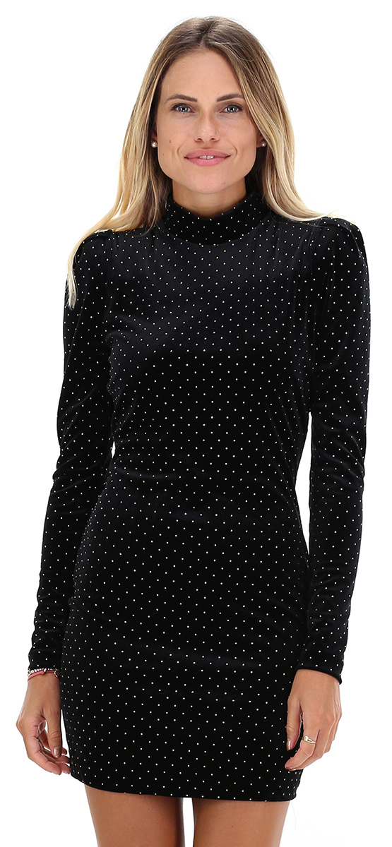 Abito in velluto stretch foderato a maniche lunghe con spalle imbottite e collo a fascetta. Zip di chiusura sul retro. Borchie gold applicate. La modella è alta 1.68 ed indossa la taglia XS.