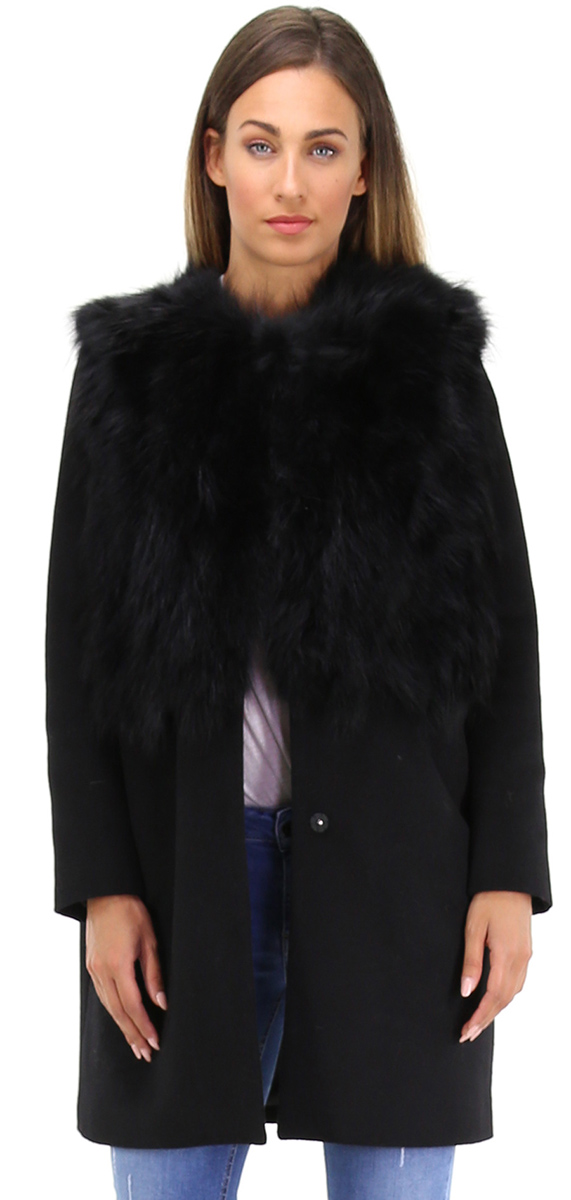 Cappotto foderato con pelo in real fur frontale, maniche lunghe, collo a giro, tasche laterali a sacchetto e automatici di chiusura frontali. Spacco profondo sul retro. La modella è alta 1,80 ed indossa la taglia 42.