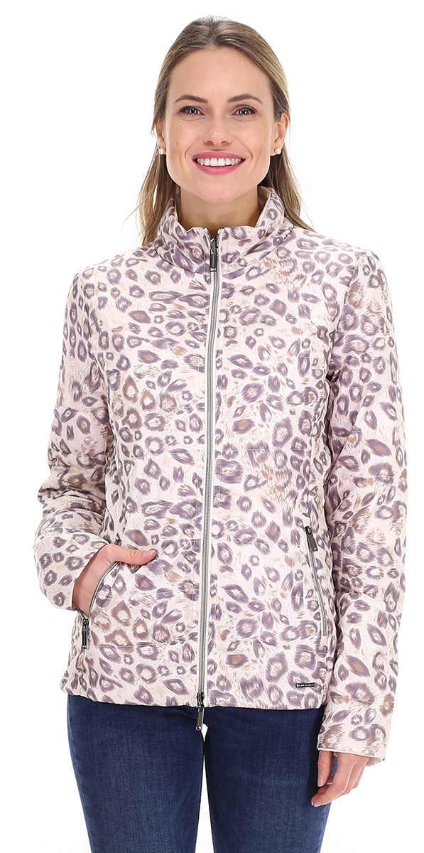 Wendbare Daunenjacke mit langen Ärmeln und Stehkragen. Beuteltaschen und doppelter Frontreißverschluss. Tierische Fantasie. Das Model ist 1,68 groß und trägt Größe XS.