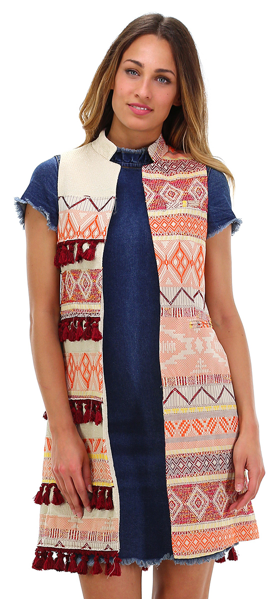 Gilet lungo, multicolor misto cotone. Fantasia patchwork con nappine inserite. Tasche a filetto frontali e spacco sul retro. La modella è alta 1,80 e indossa la taglia 44.