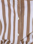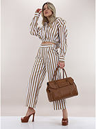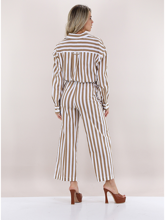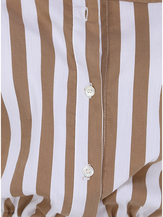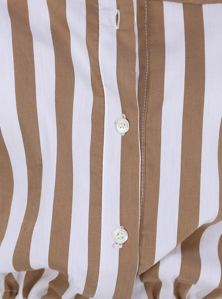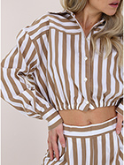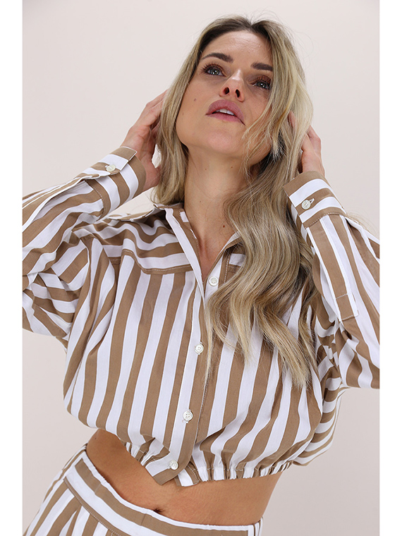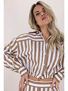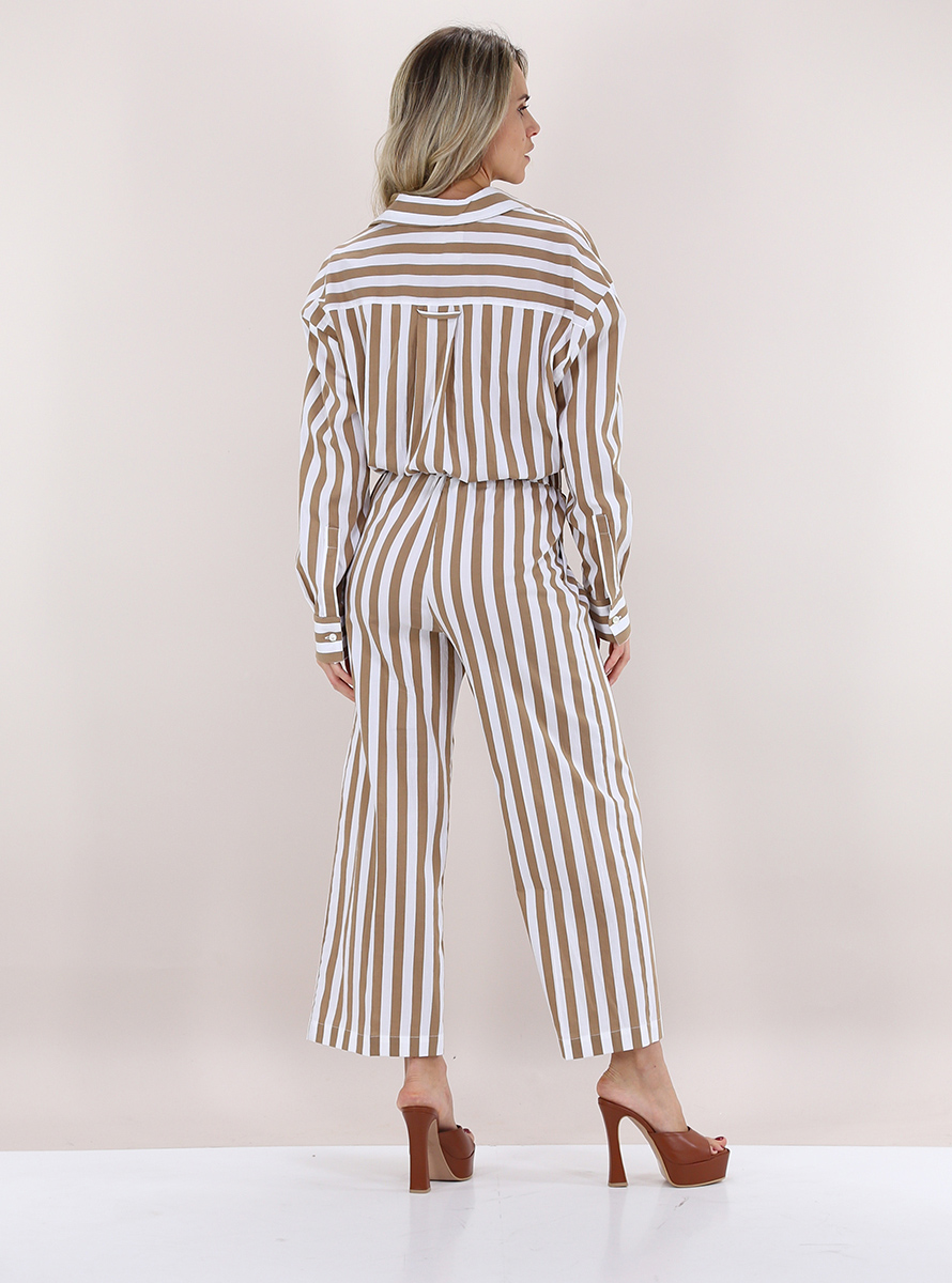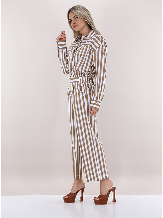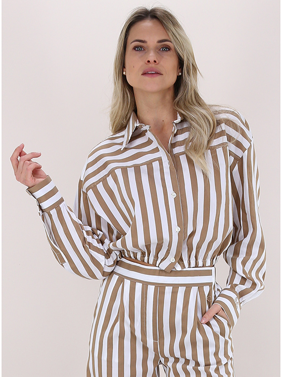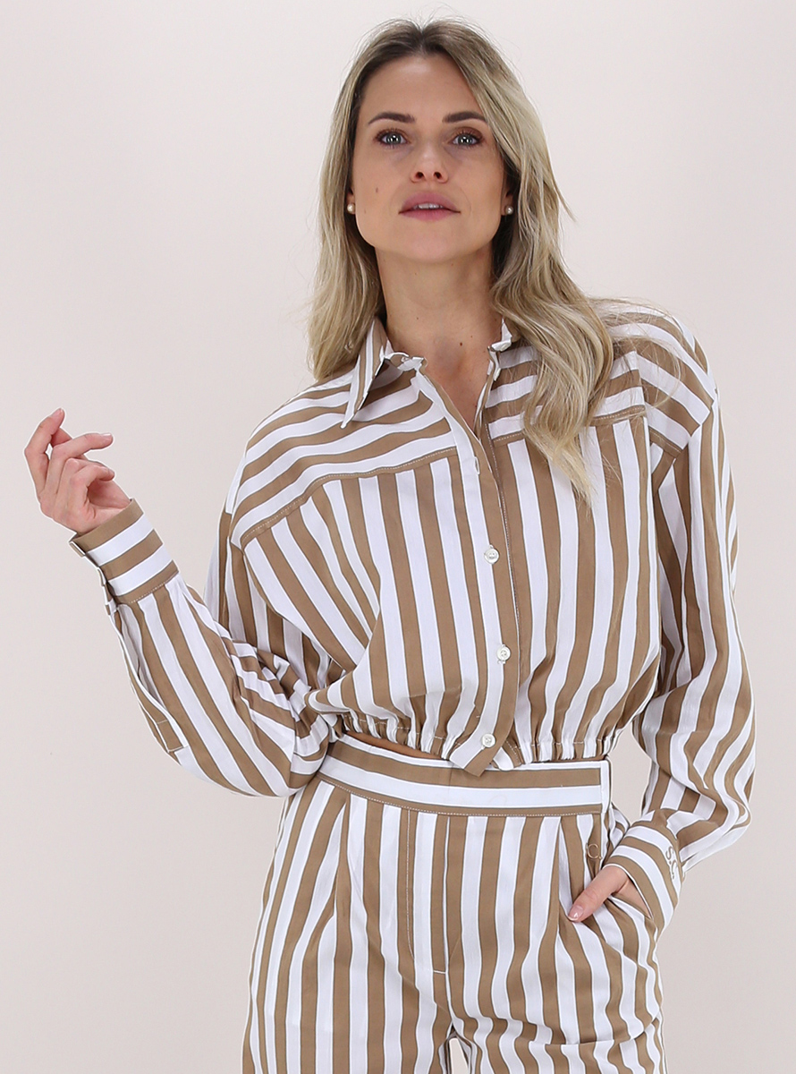 Kurz geschnittenes Semicouture-Hemd aus elastischer Baumwolle. Lange Ärmel und klassischer Kragen. Elastische Taille. Zweifarbiges Streifenmuster. Das Model ist 1,68 groß und trägt Größe 40.