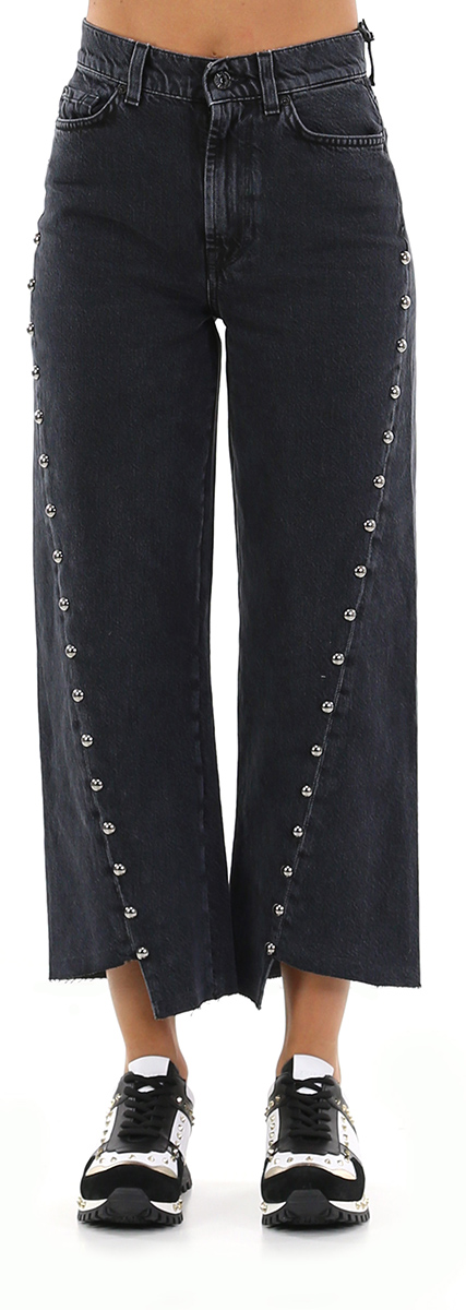 Cropped-Jeans mit hoher Taille. Schräge Frontschnitte mit Nietenapplikationen. Das Model ist 1,68 groß und trägt Größe 25.