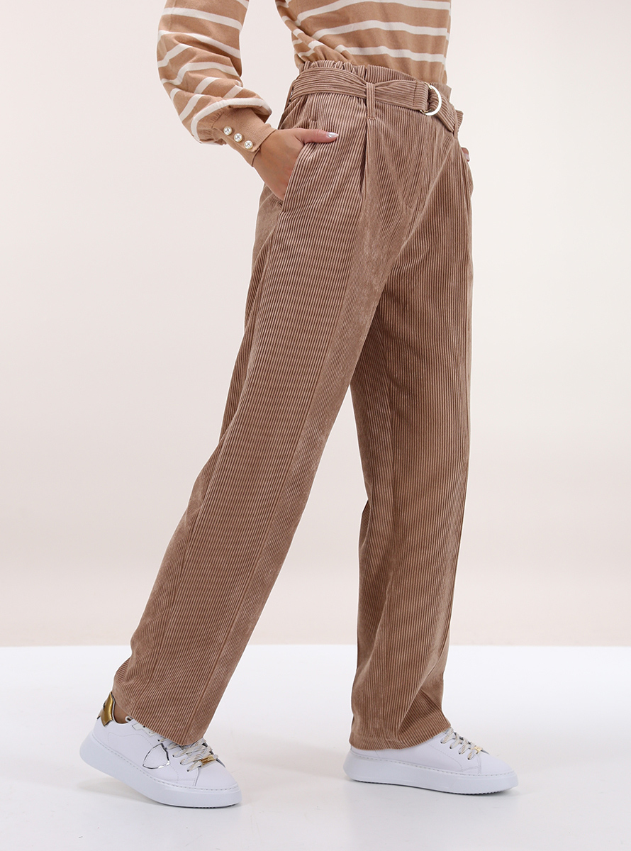 Liu.jo Moleskin-Hose mit hoher Taille und Gummizug. Leisten- und Kängurutaschen hinten. Vorderfalten und Gürtel inklusive. Das Model ist 1,70 groß und trägt Größe 40.