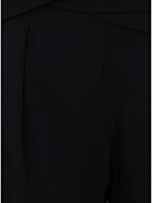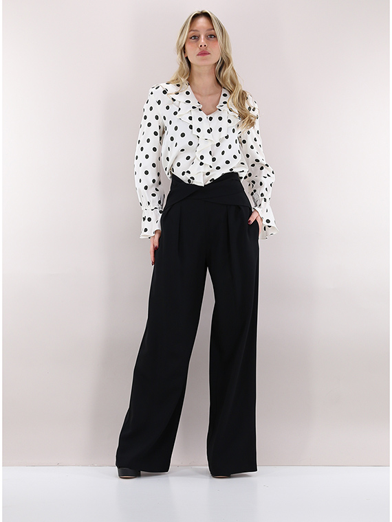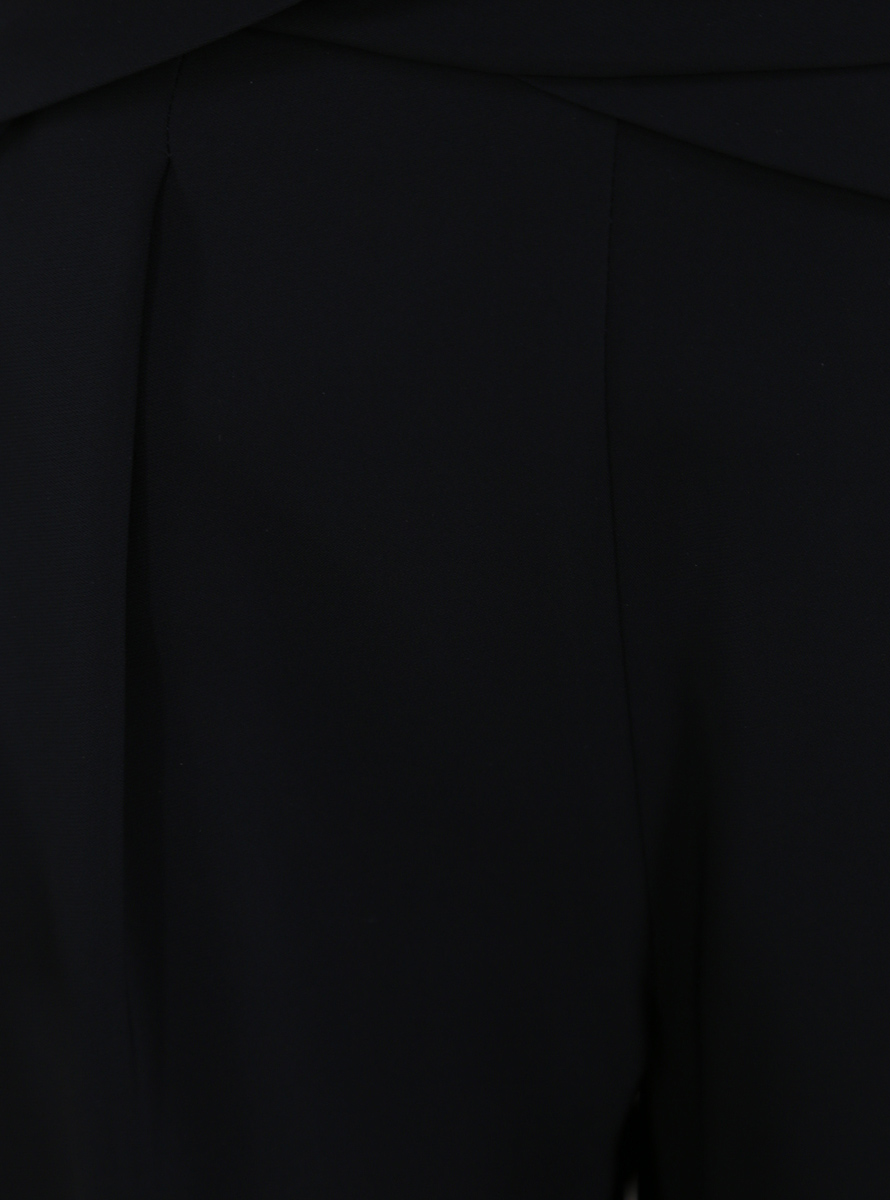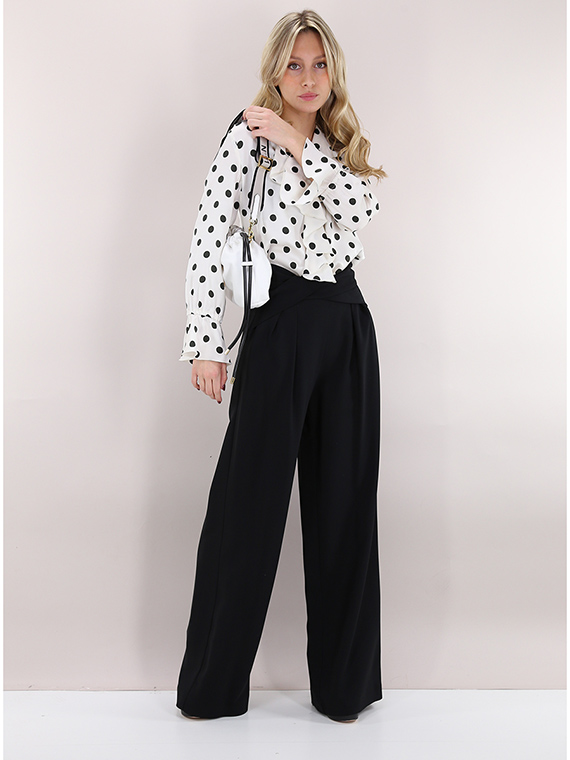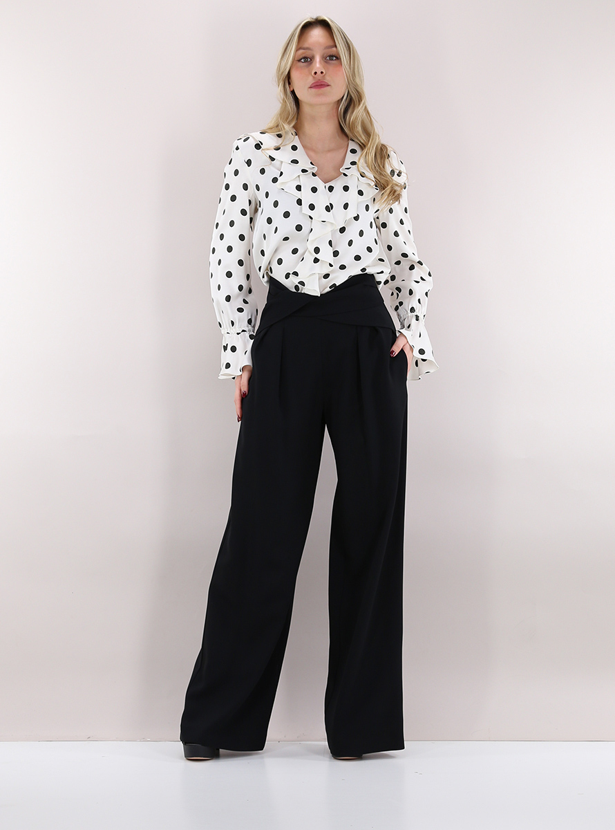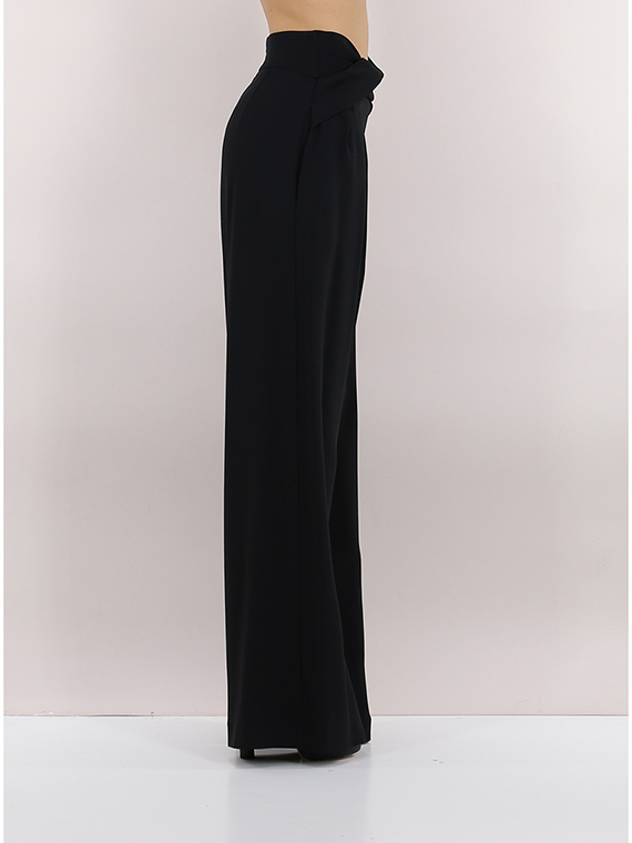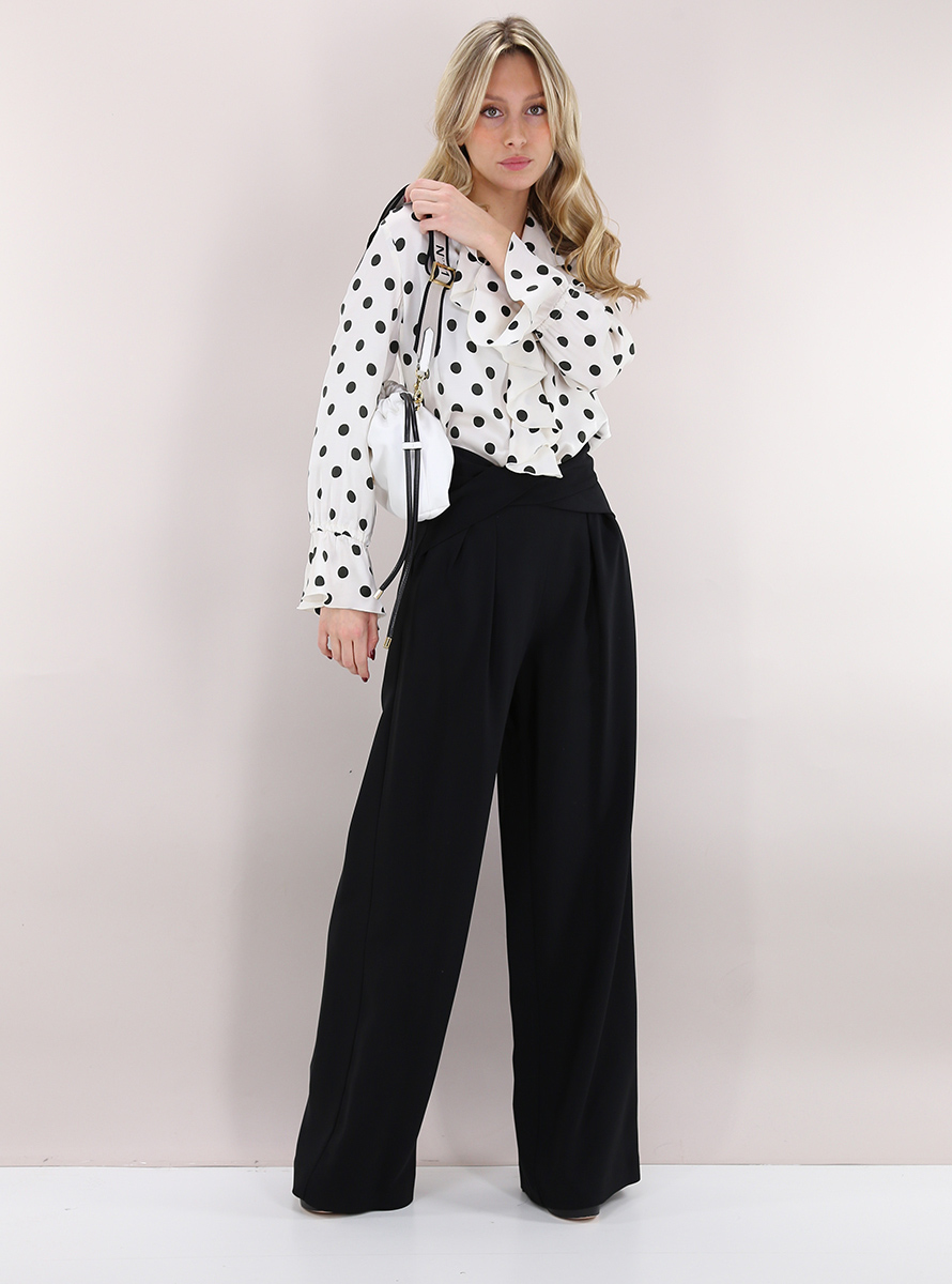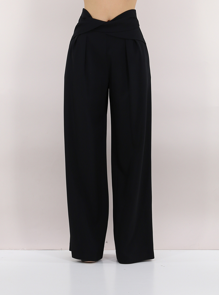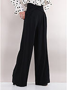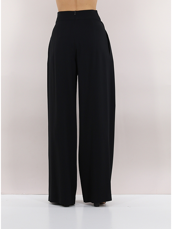 Simona Corsellini Palazzohose aus Viskosemischung. Vorderfalten, Paspeltaschen und asymmetrischer Crossover an der Taille. Das Model ist 1,74 cm groß und trägt Größe 40.