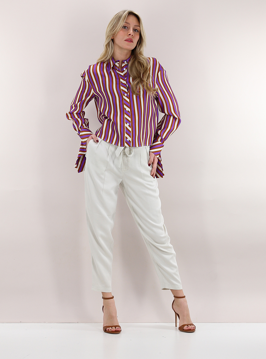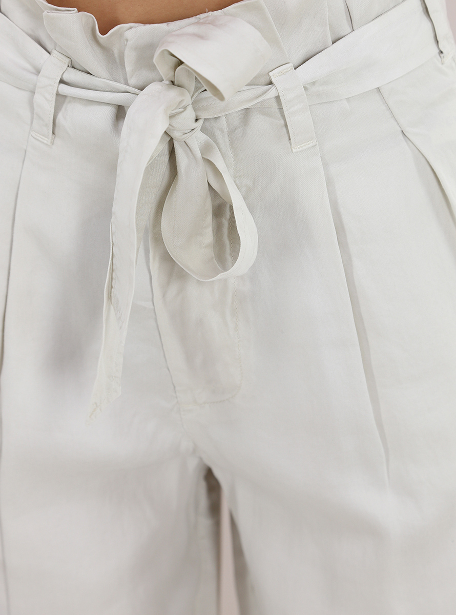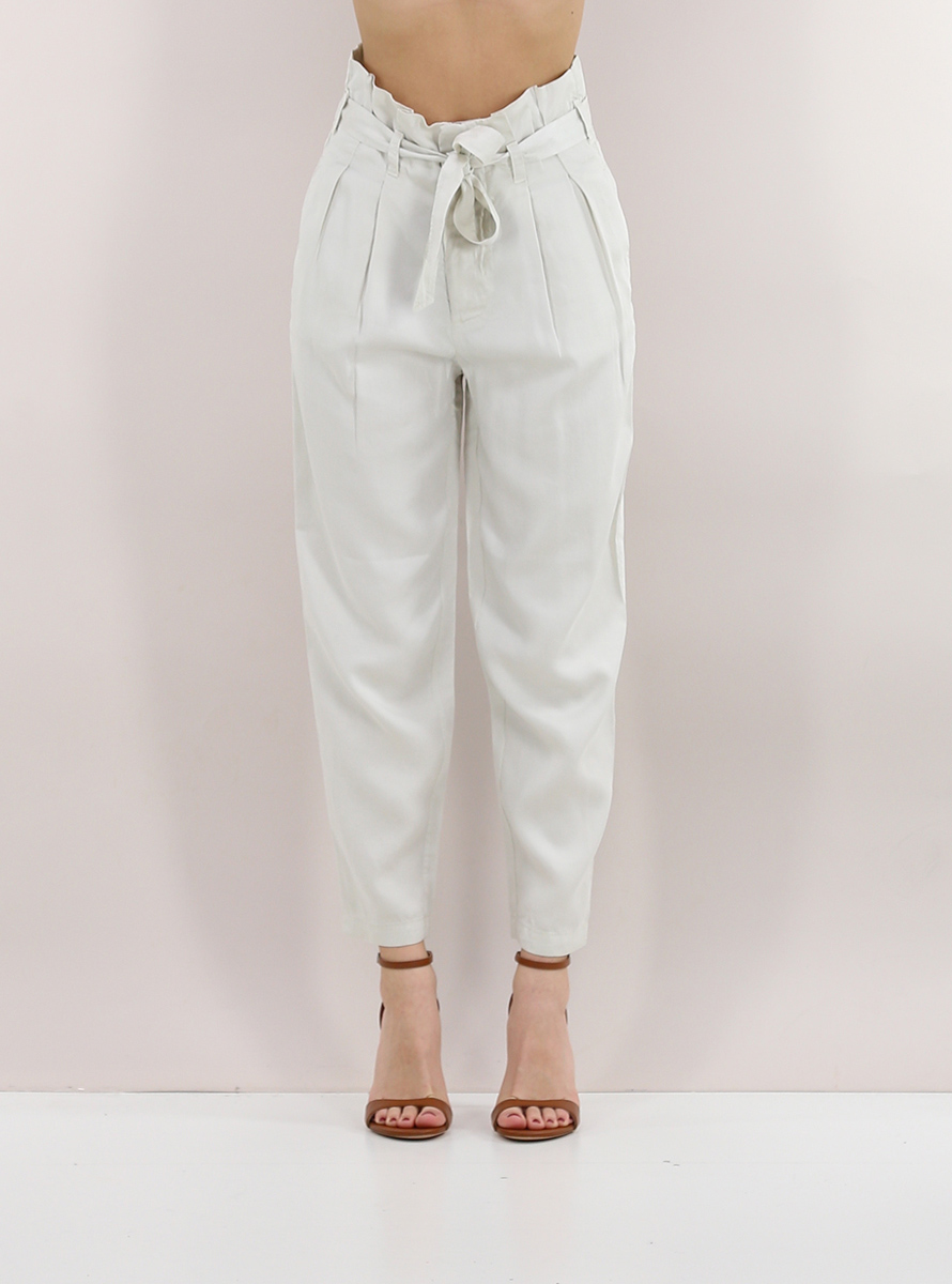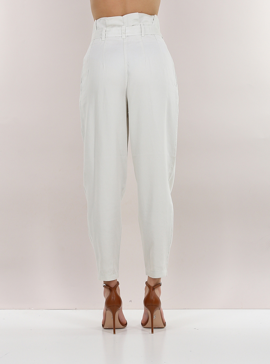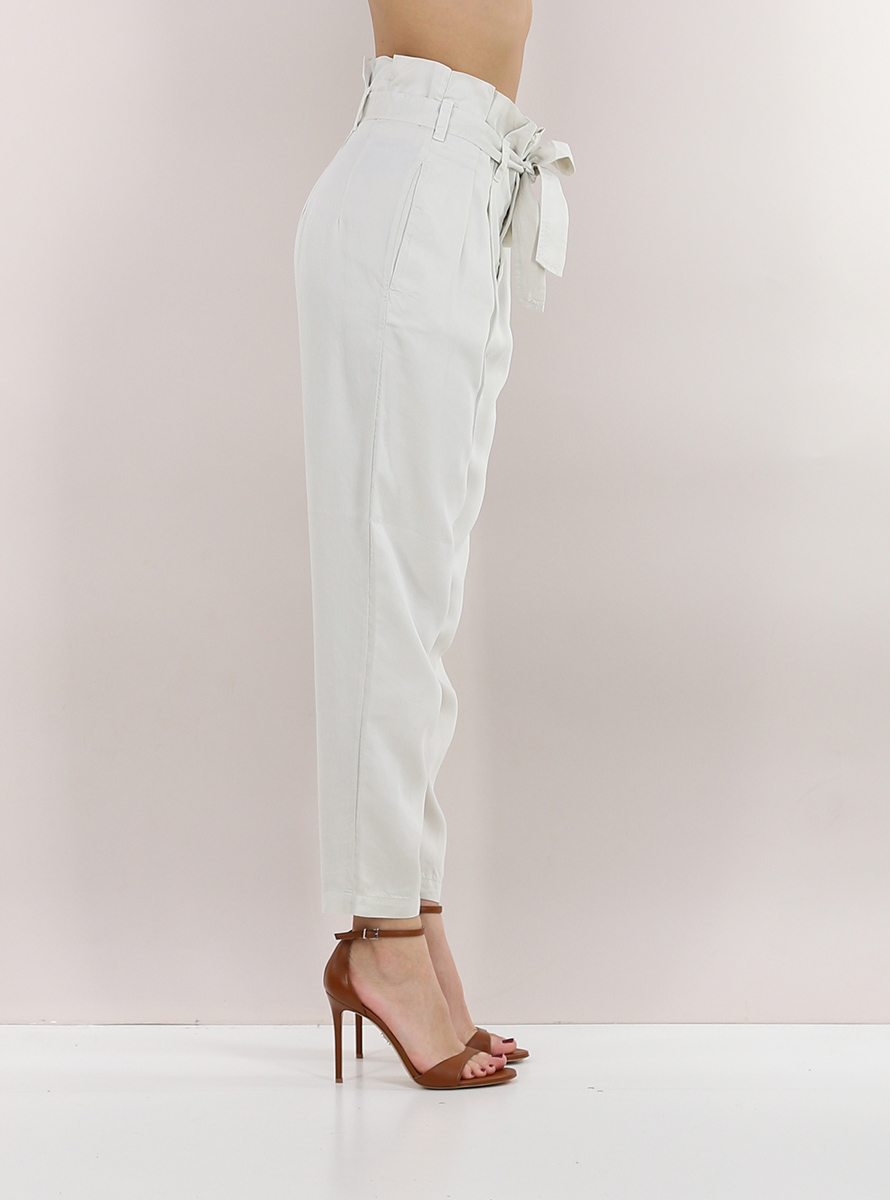 Tandem-Candy-Hose aus Lyocell. Kängurutaschen und Falten vorne. Inklusive Stoffgürtel. Das Model ist 1,70 groß und trägt Größe 38.