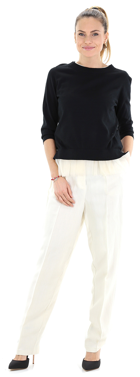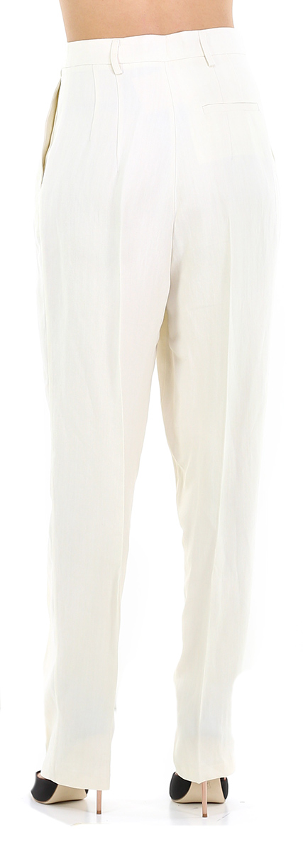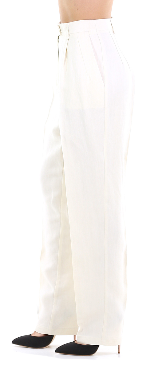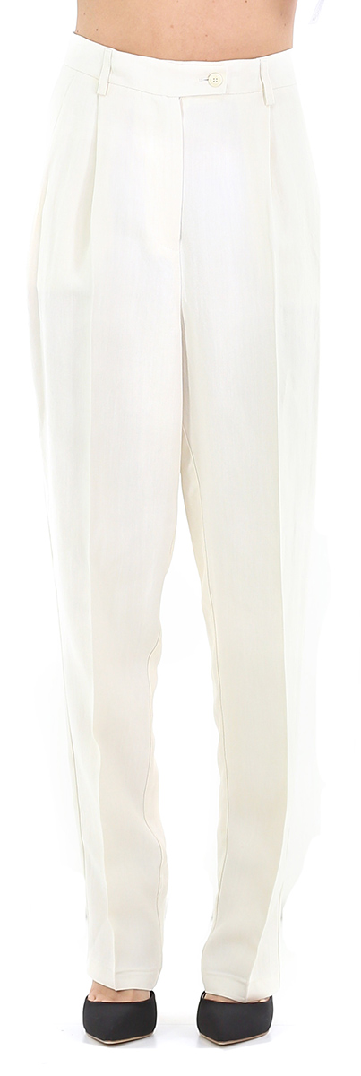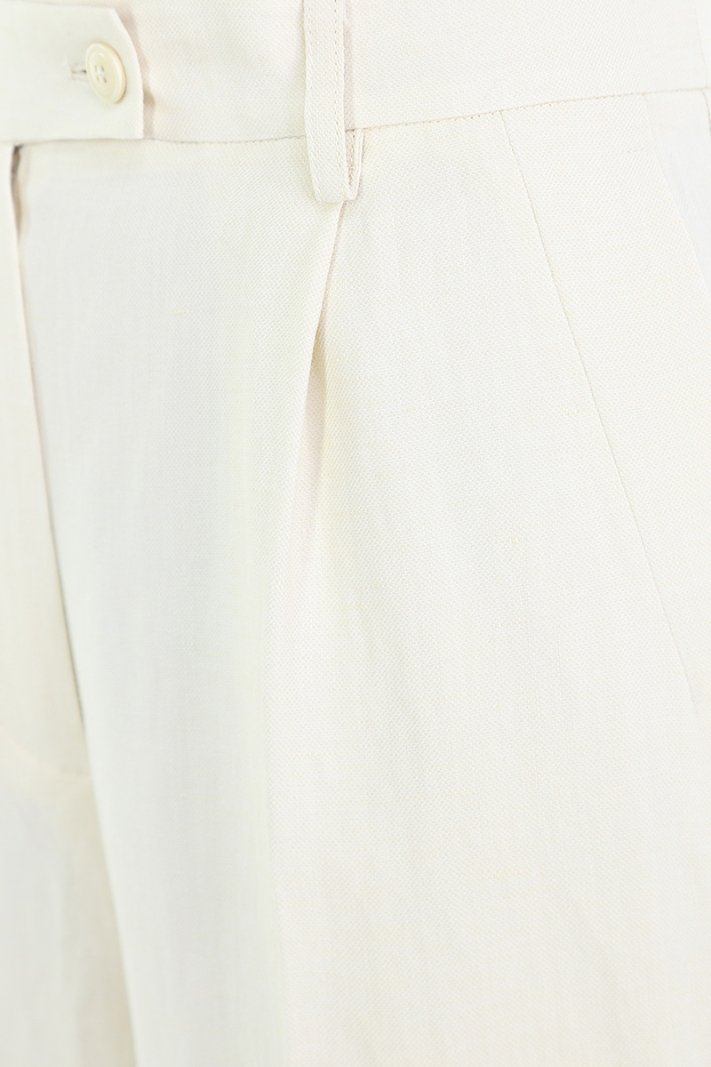 Hose aus weicher Viskose und Leinen mit Bundfalten, Eingrifftaschen an den Seiten und Paspeltaschen auf der Rückseite. Das Model ist 1,68 groß und trägt Größe 40.