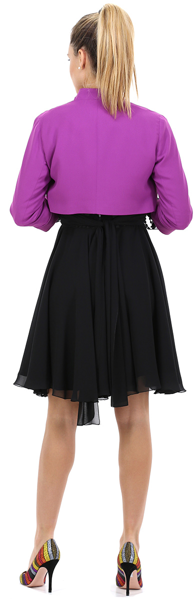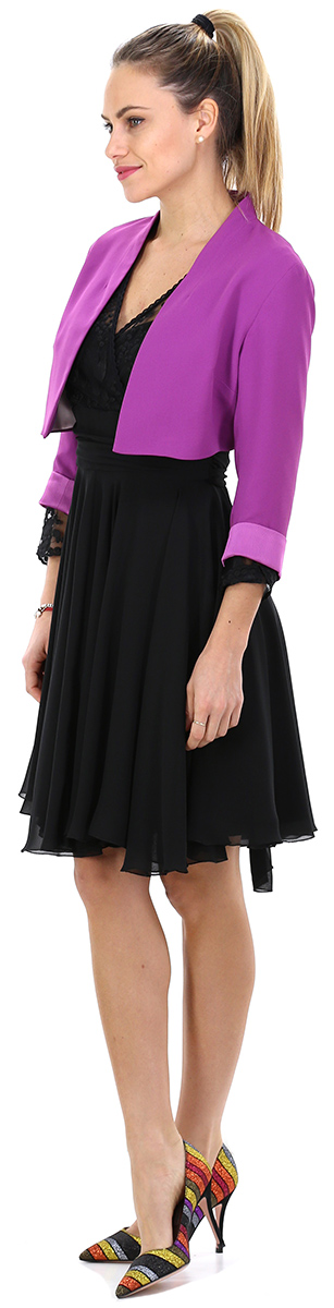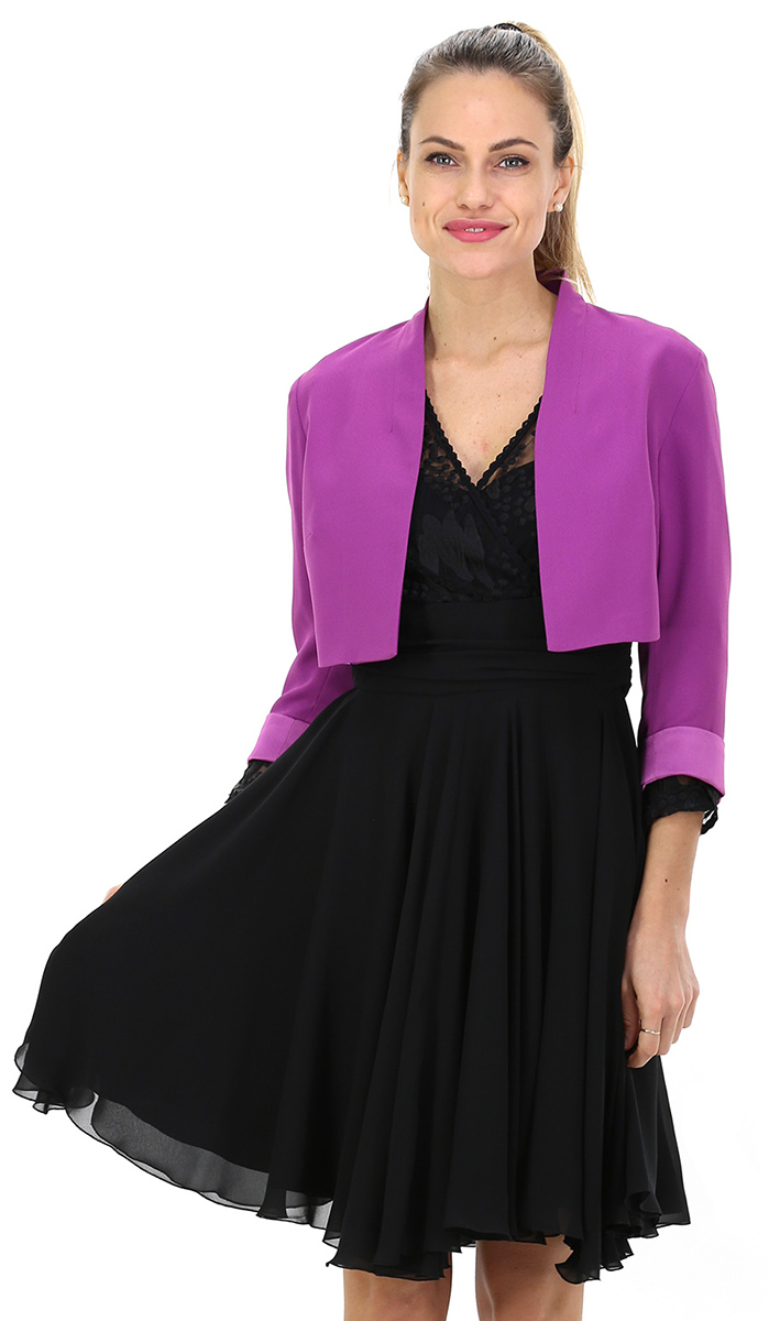 Bolero aus gefüttertem Cady. Dreiviertelärmel mit kontrastierendem Umschlag unten. Das Model ist 1,80 groß und trägt Größe 42.