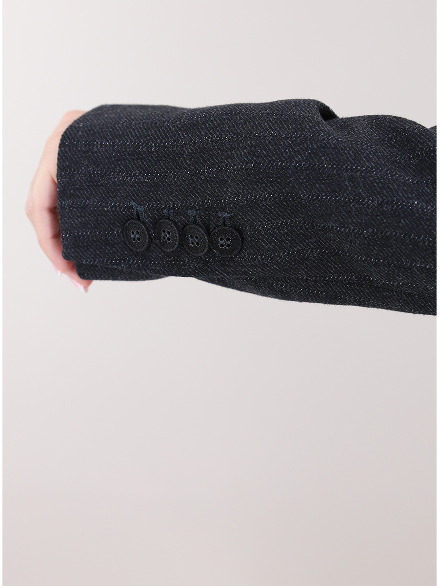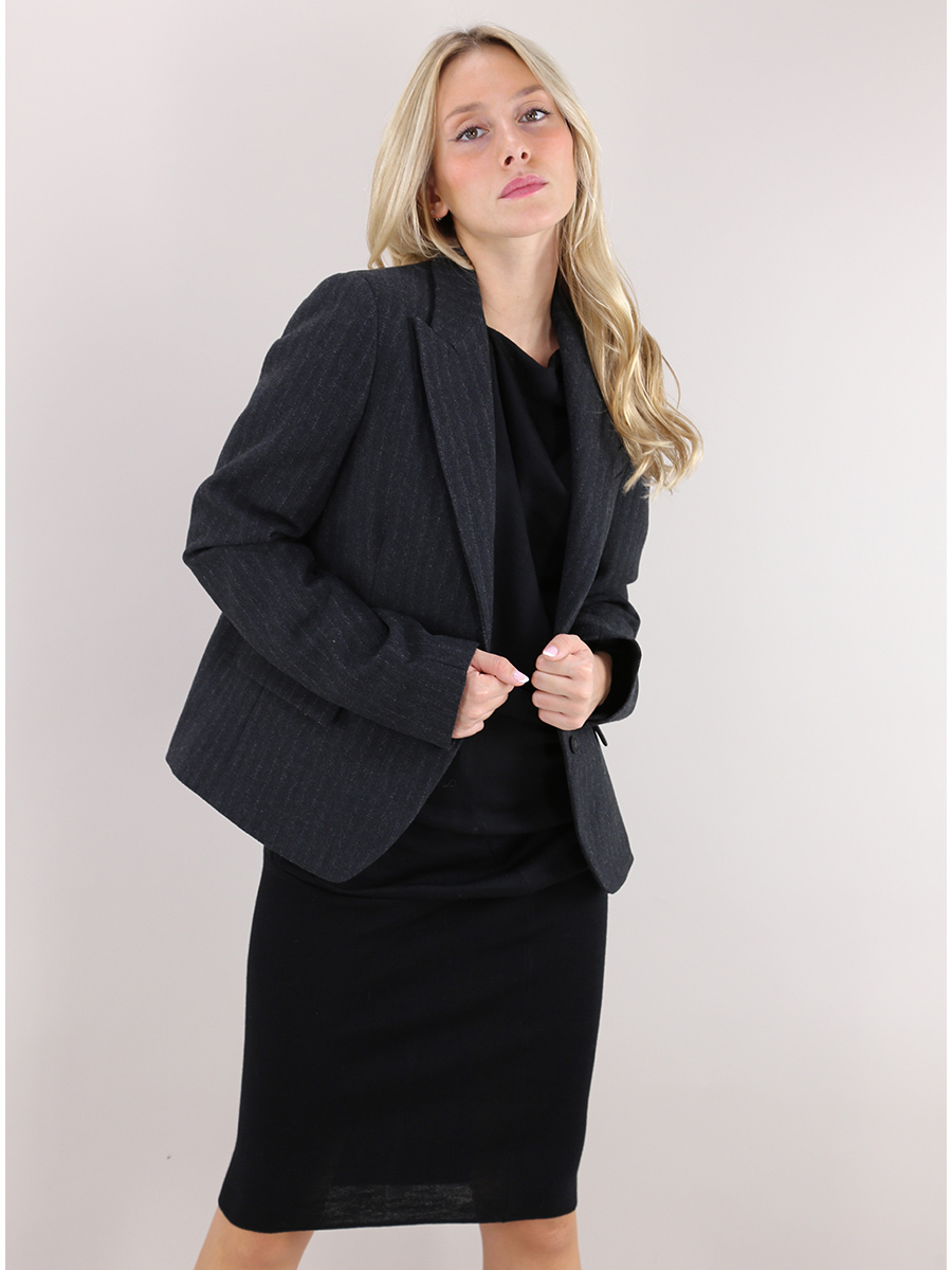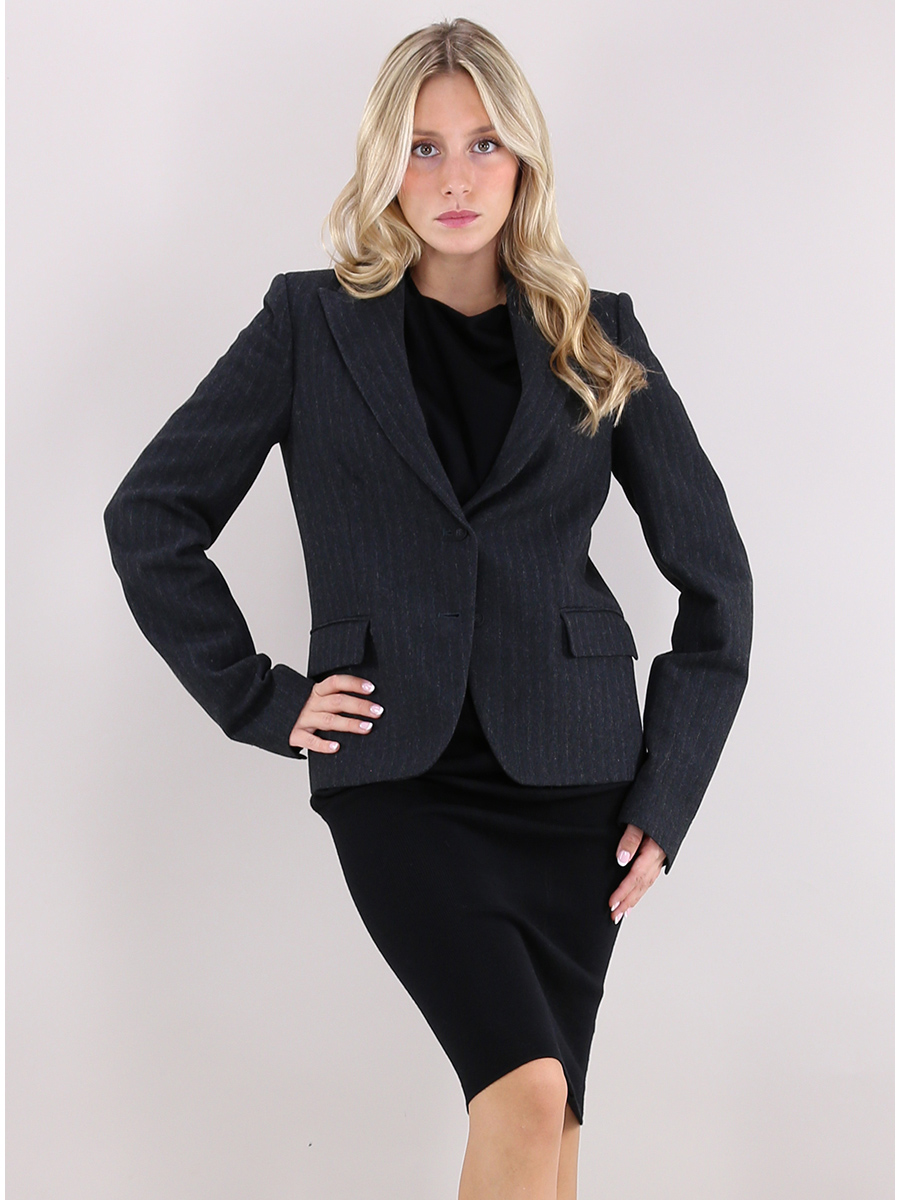 Malloni-Jacke aus Wolle mit Baumwollfutter. Reverskragen mit langen Ärmeln. Taschen mit Klappen und Frontverschlussknöpfen. Nadelstreifen-Fantasie. Das Model ist 1,70 cm groß und trägt Größe 40.