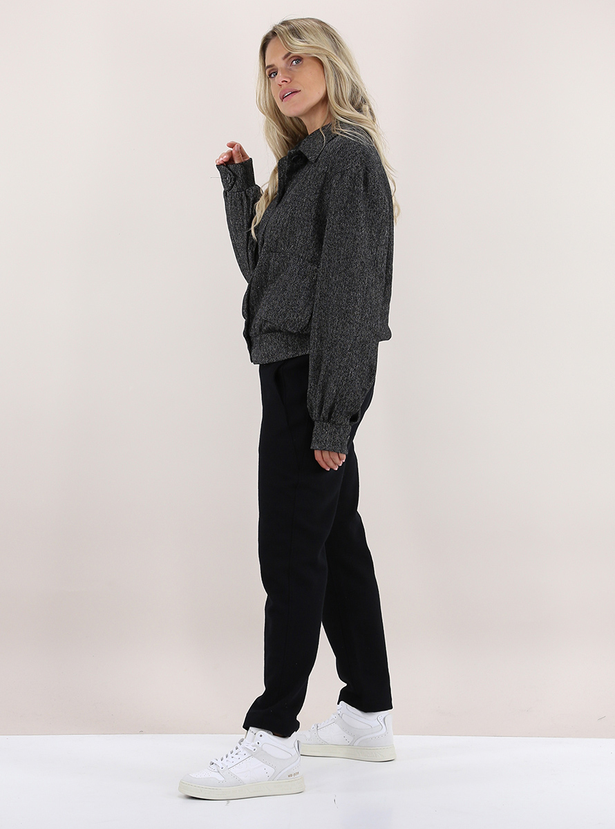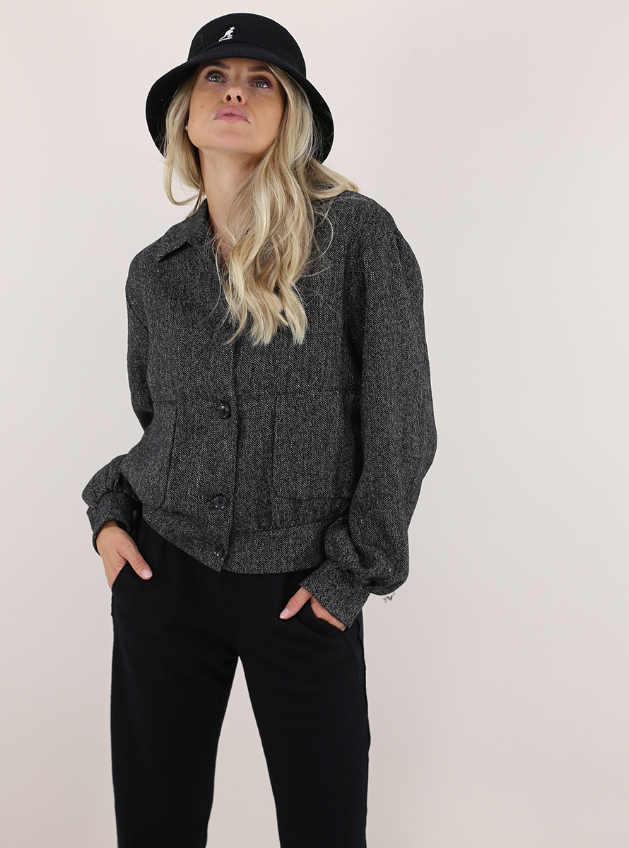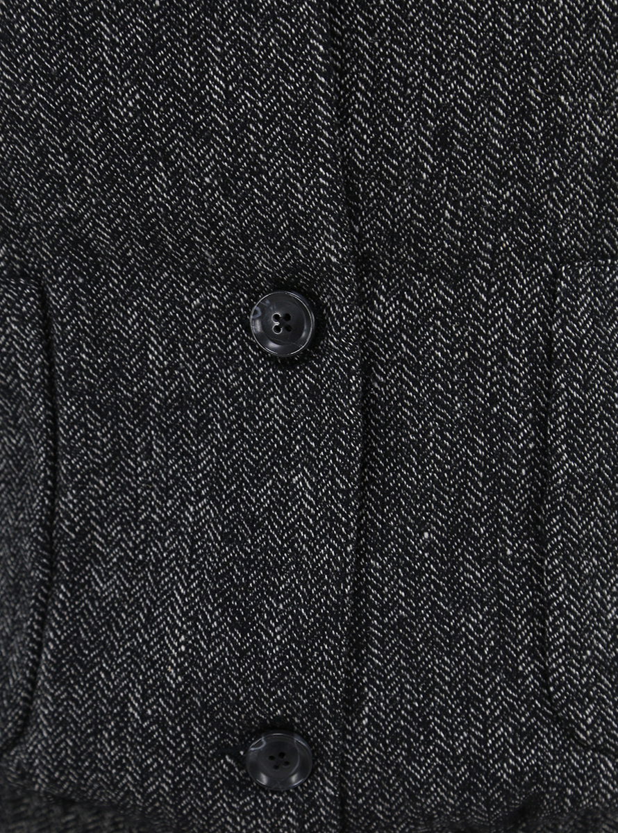 Tandemjacke aus gefütterter Mischung aus Leinen und Wolle. Weite lange Ärmel mit Manschetten und klassischem Kragen. Aufgesetzte Taschen und Verschlussknöpfe. Stachelige Fantasie. Das Model ist 1,68 groß und trägt Größe 40.
