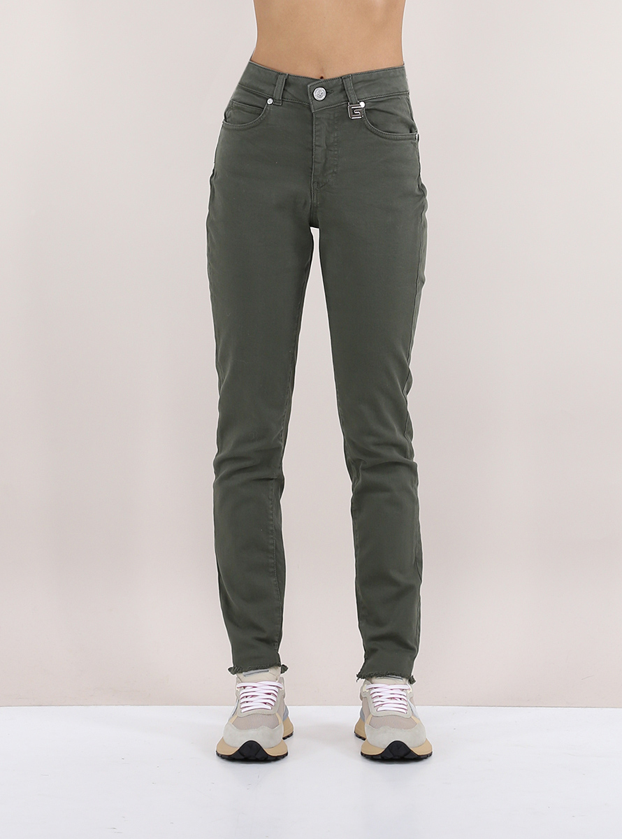 Gaelle Paris Jeans aus Stretch-Baumwolldenim. Hohe Taille und schmale Passform. Unten mit roh geschnittenen Schlitzen. Das Model ist 1,70 groß und trägt Größe 26.