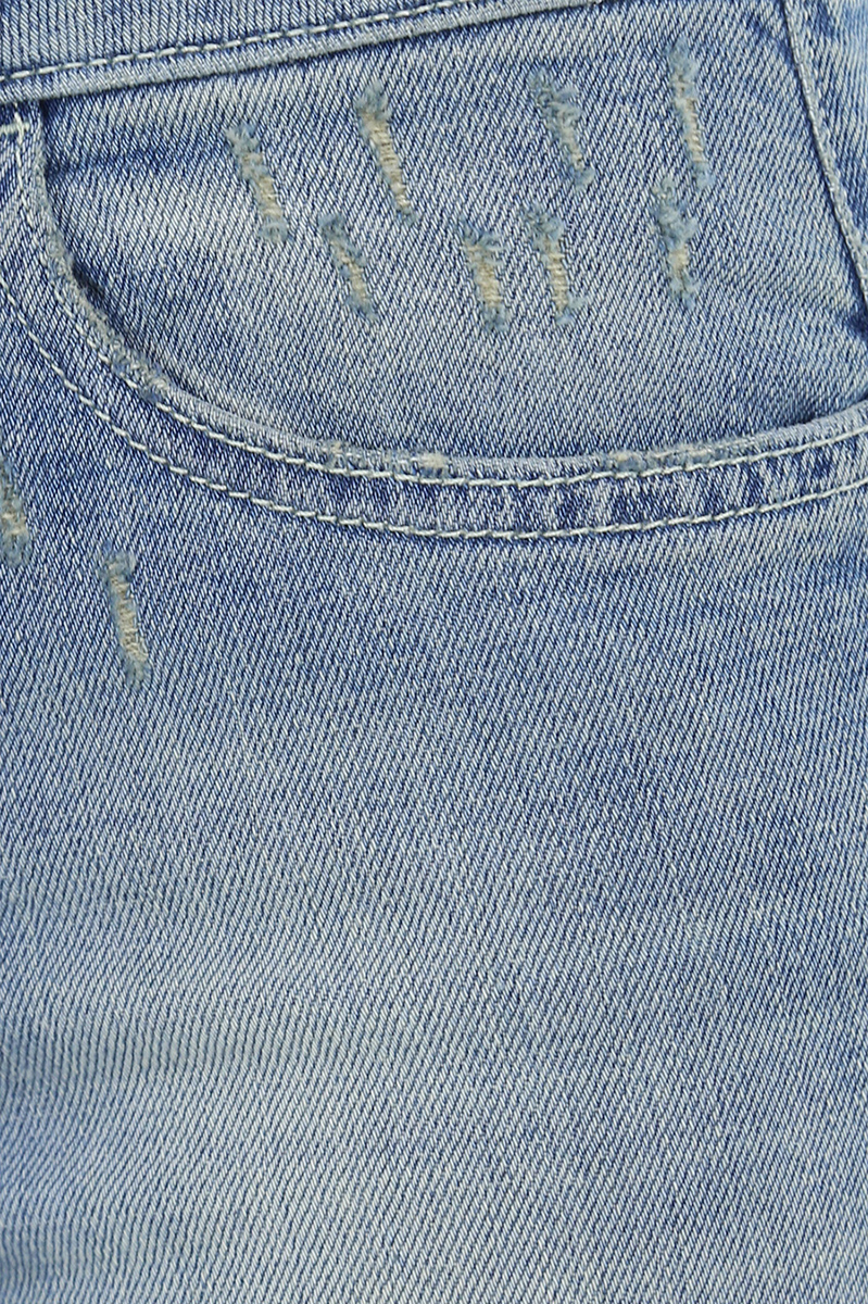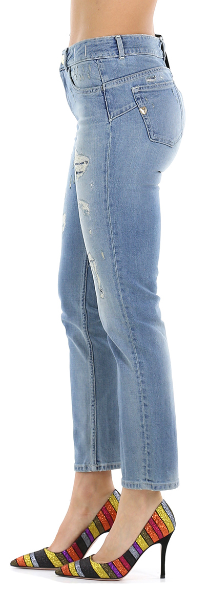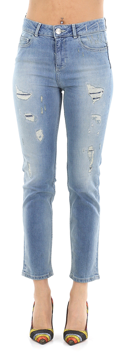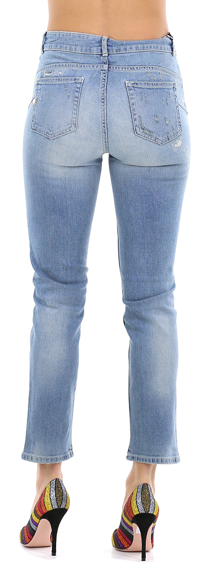 Röhrenjeans aus Stretch-Baumwolle. Abgenutzter Effekt vorne und hinten. Das Model ist 1,68 groß und trägt Größe 25.