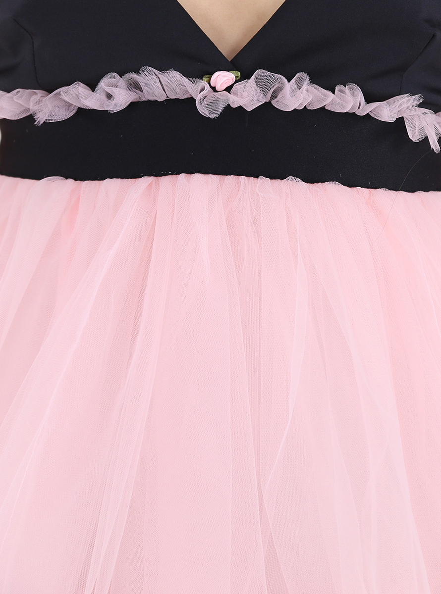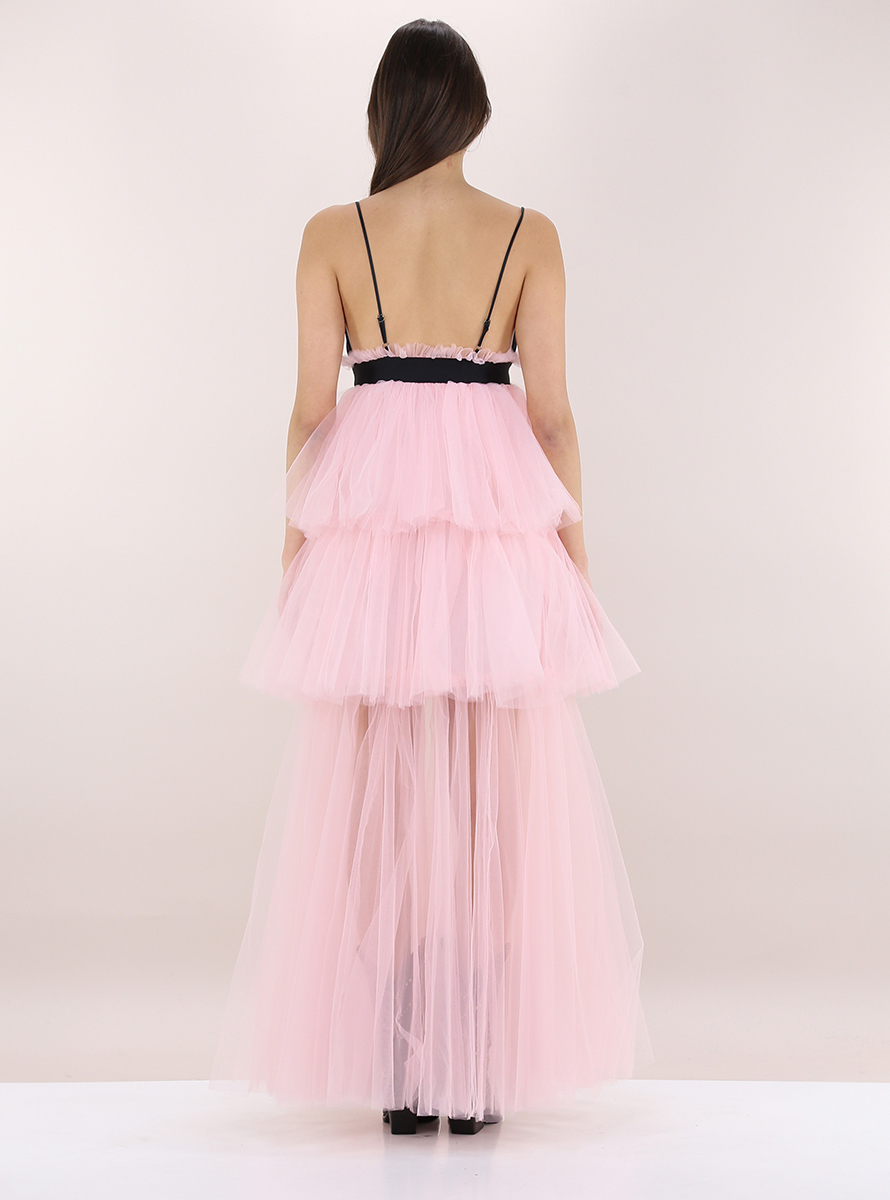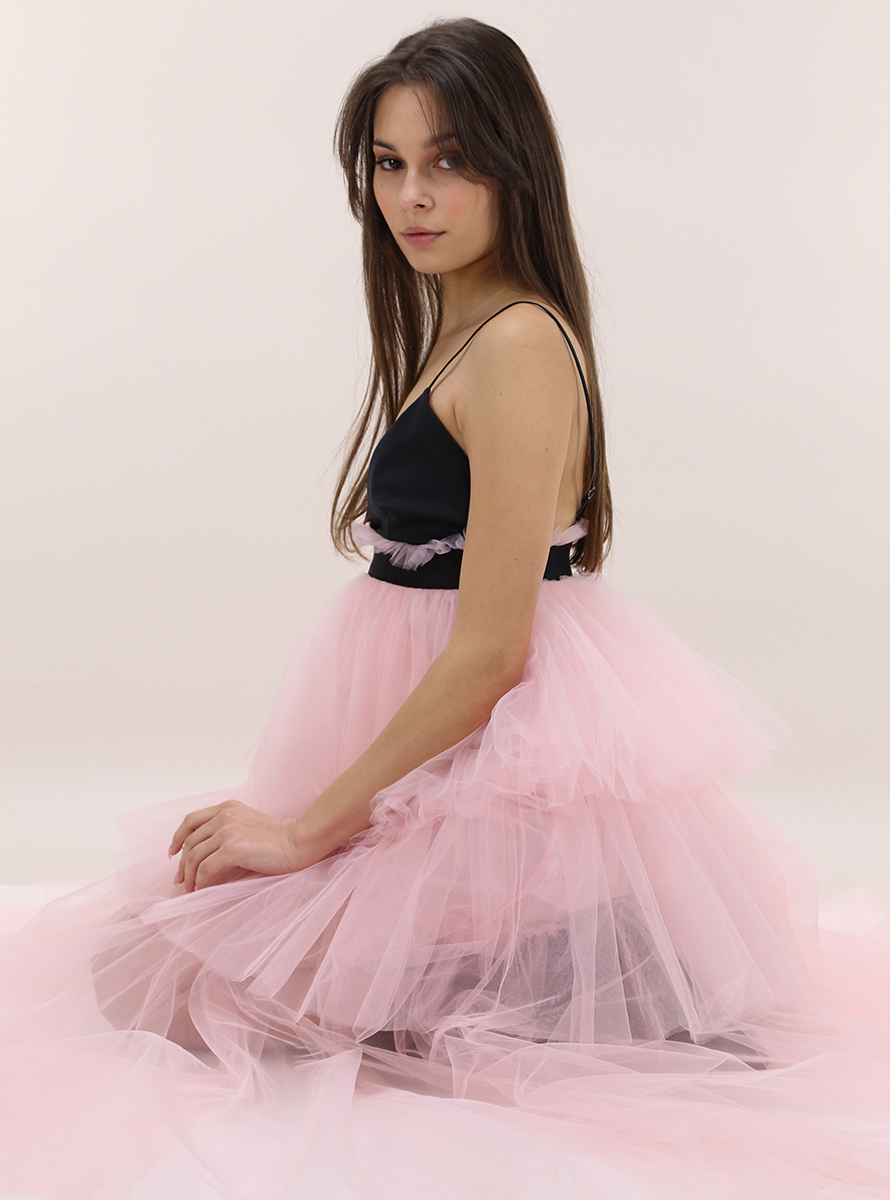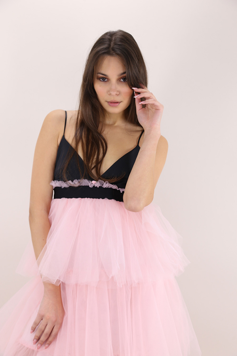 Aniye By gefüttertes Unterkleid. Mieder aus kontrastierendem Satin mit Gummizug und V-Ausschnitt, Rock mit gerafften Tüllvolants. Das Model ist 1,68 groß und trägt Größe 40.