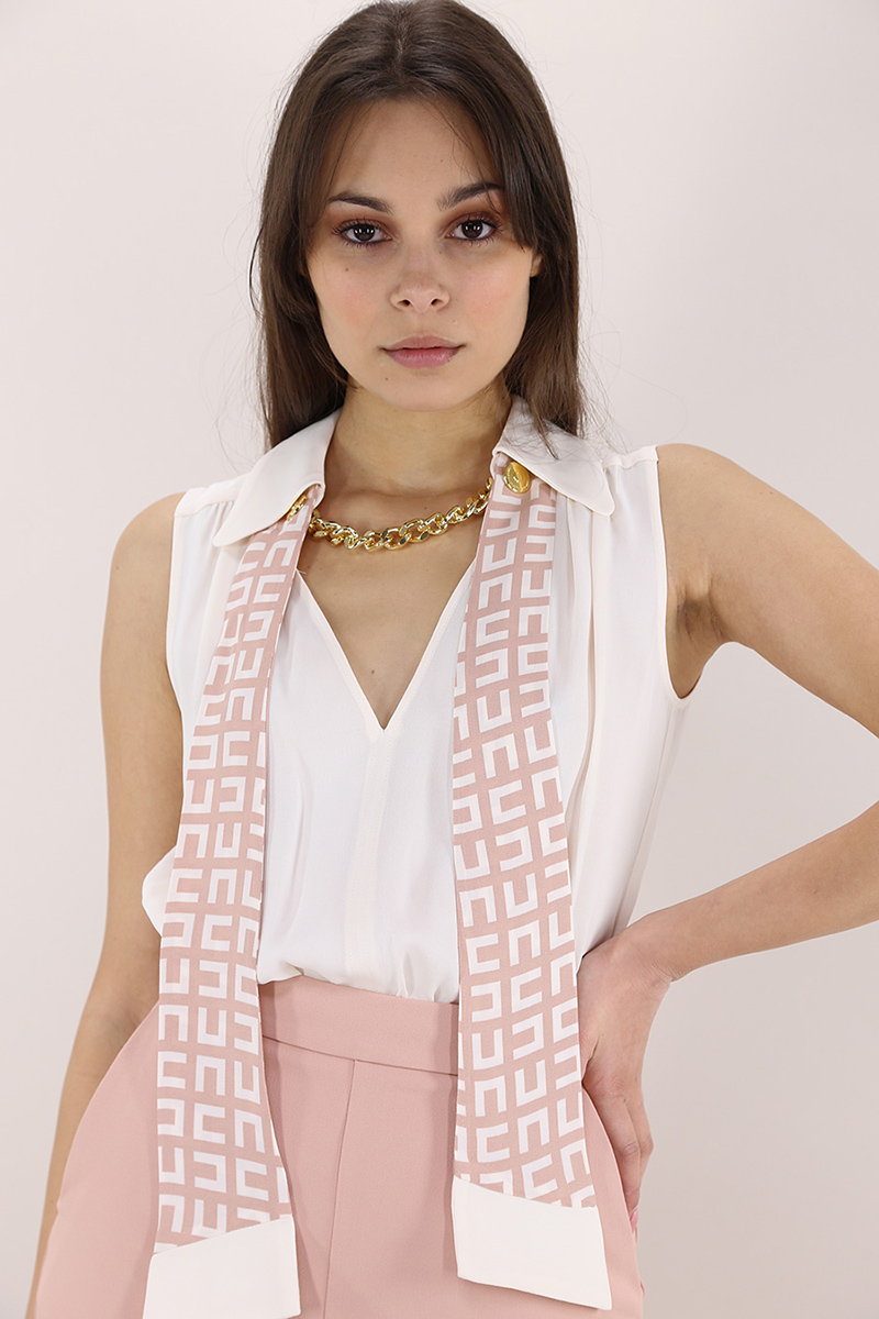 Elisabetta Franchi Jumpsuit mit Patch und abnehmbarem Oberteil. Klassischer Kragen mit Schleife mit Monogramm-Aufdruck und goldener Kette. Hose mit geradem Bein mit Reißverschluss und Befestigungshaken auf der Rückseite. Das Model ist 1,68 groß und trägt Größe 40.