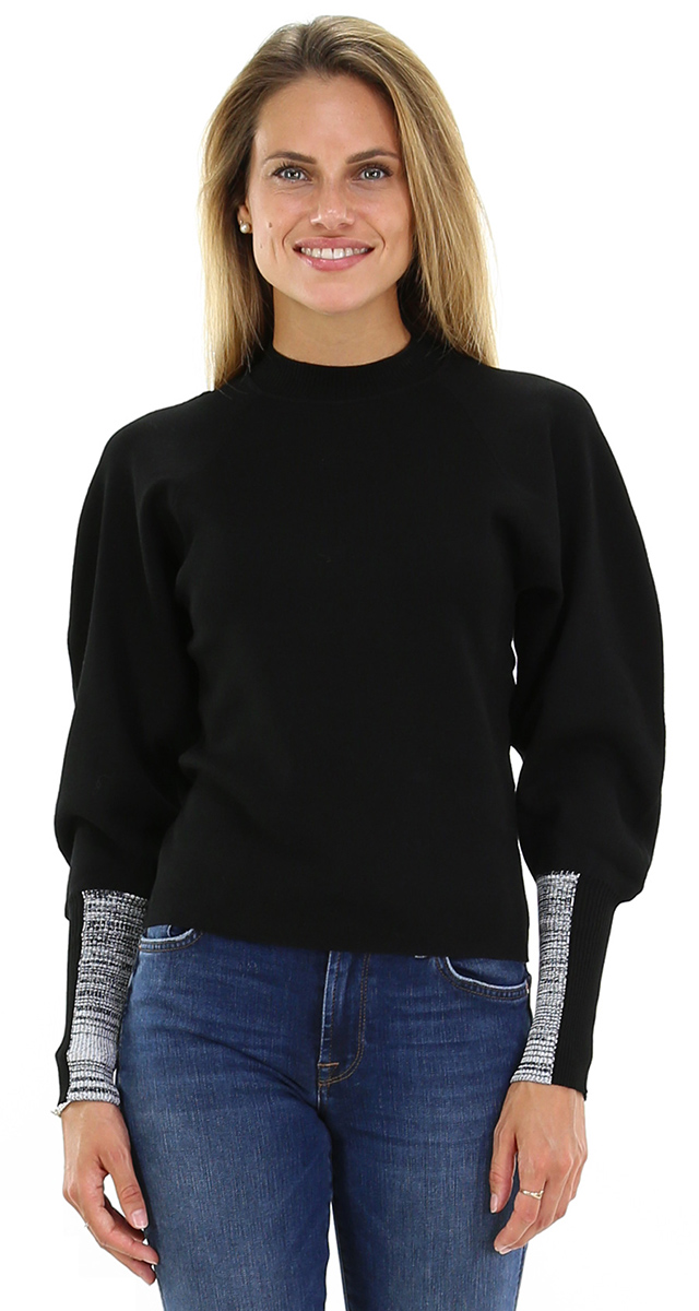 Maglia in misto viscosa, maniche a palloncino lunghe con polso bicolor alto. Collo a giro. La modella è alta 1.68 ed indossa la taglia S.