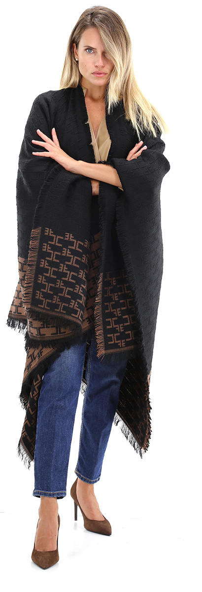 Mantella in misto viscosa e lana. Bordi frangiati e stampa logata sul fondo. La modella è alta 1,68 cm ed indossa la taglia unica.