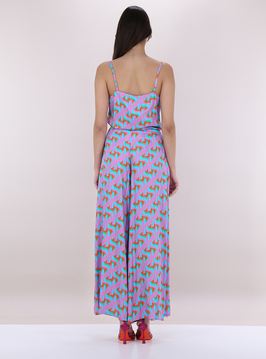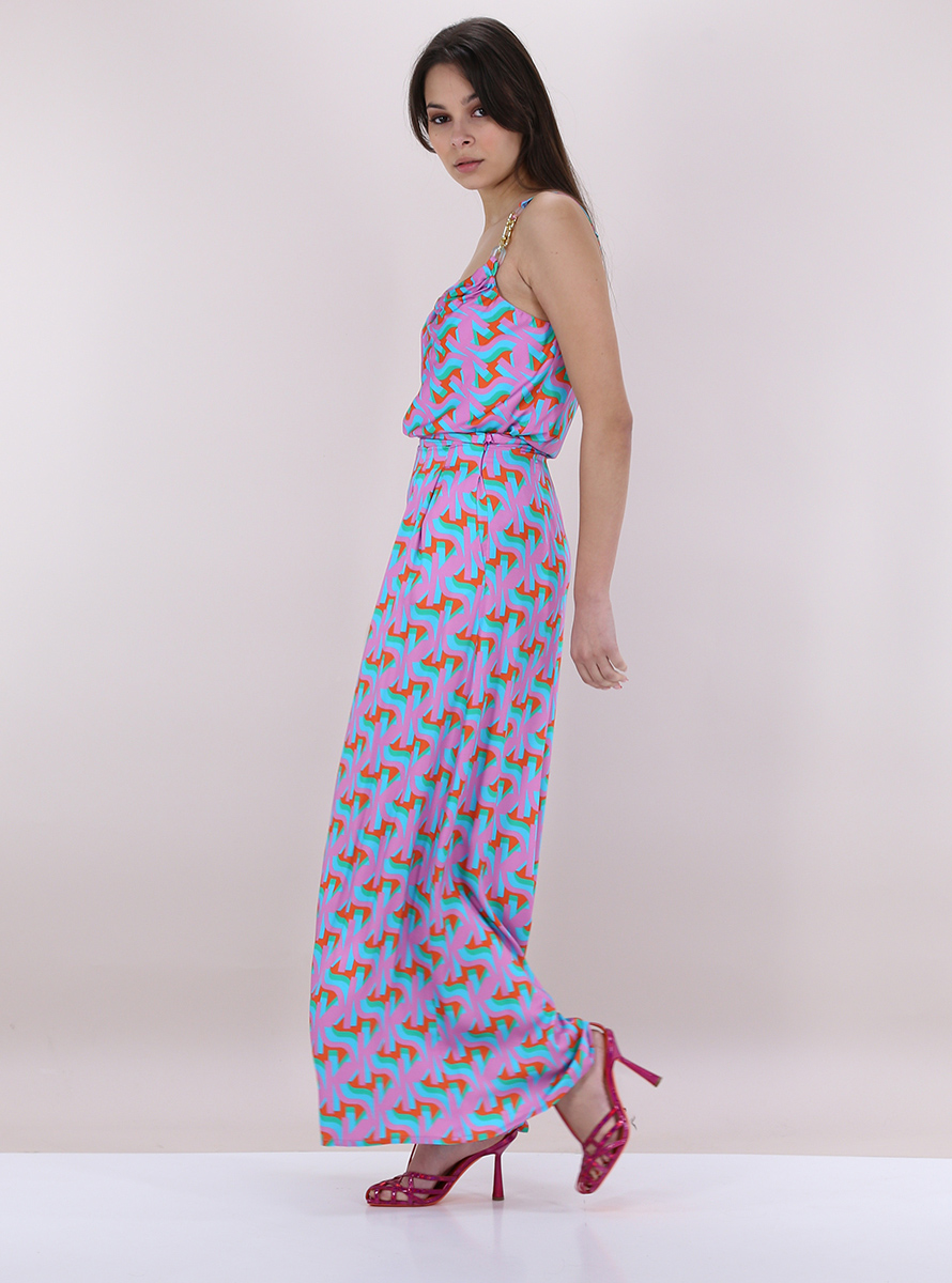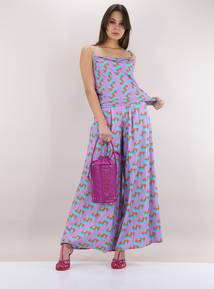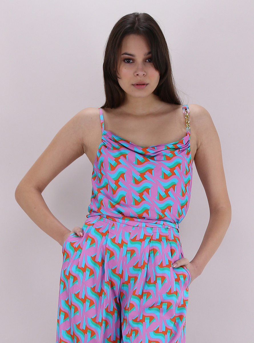 Kocca Top aus Viskose mit Wasserfallausschnitt und verstellbaren Trägern mit goldener Kette. Geometrisches Muster. Das Model ist 1,75 groß und trägt Größe XS.