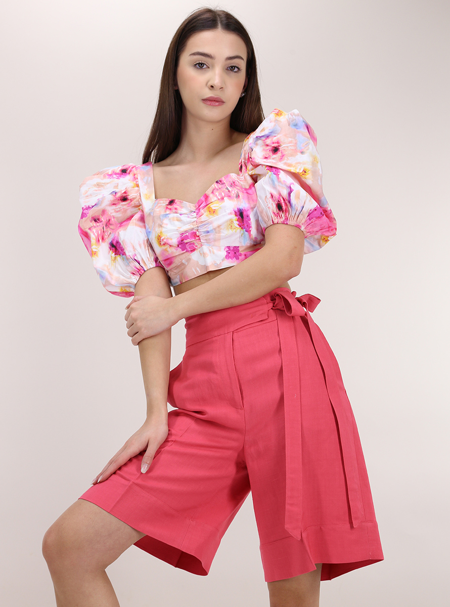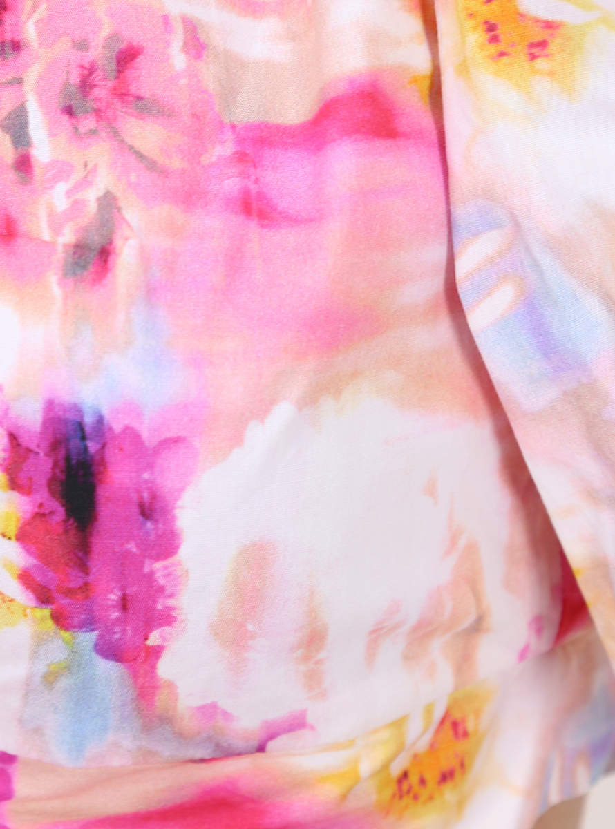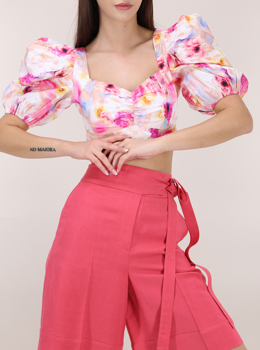 Twin Set Actitude Cropped-Top aus Baumwolle mit Puffärmeln und eckigem Ausschnitt. Gummizüge auf der Rückseite. Mehrfarbige Fantasie. Das Model ist 1,70 groß und trägt Größe XS.