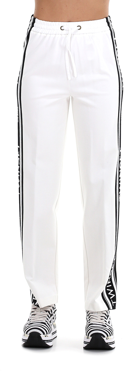 Pantalone tuta in jersey con bande laterali a contrasto logate ed elastico con coulisse in vita. La modella è alta 1.68 ed indossa la taglia 38.