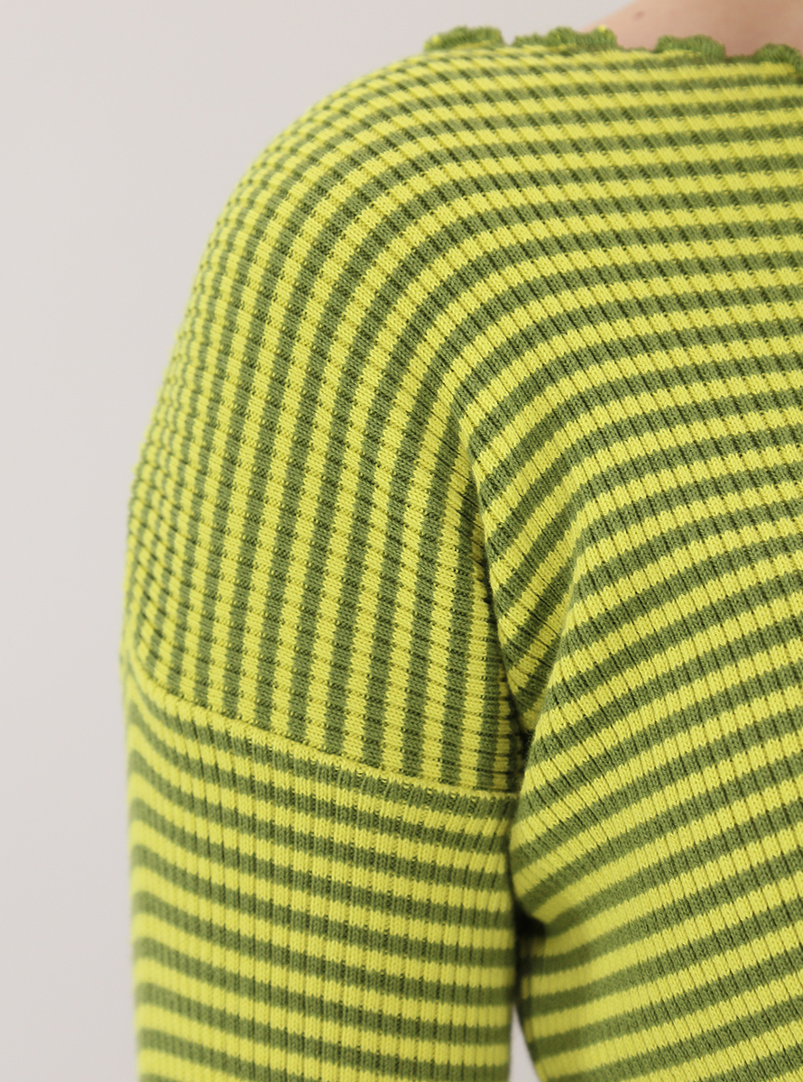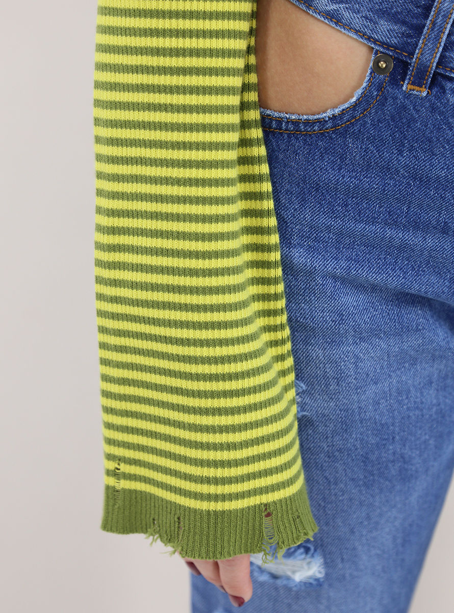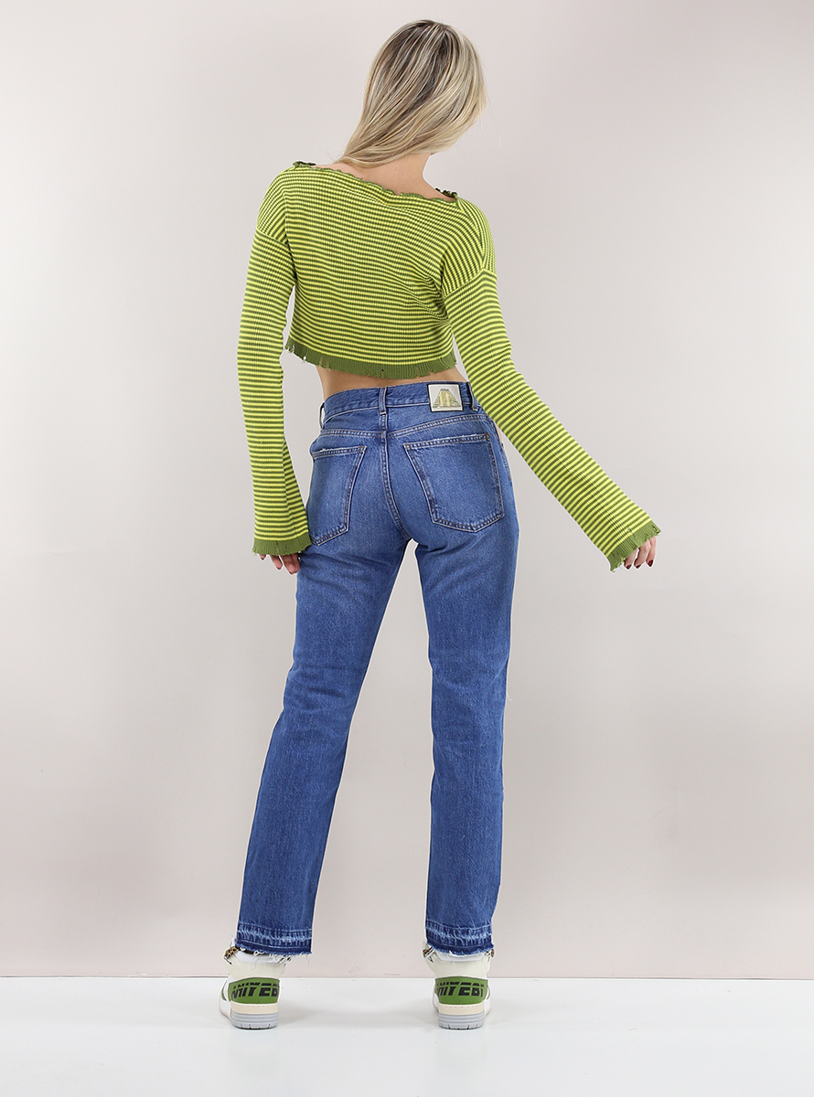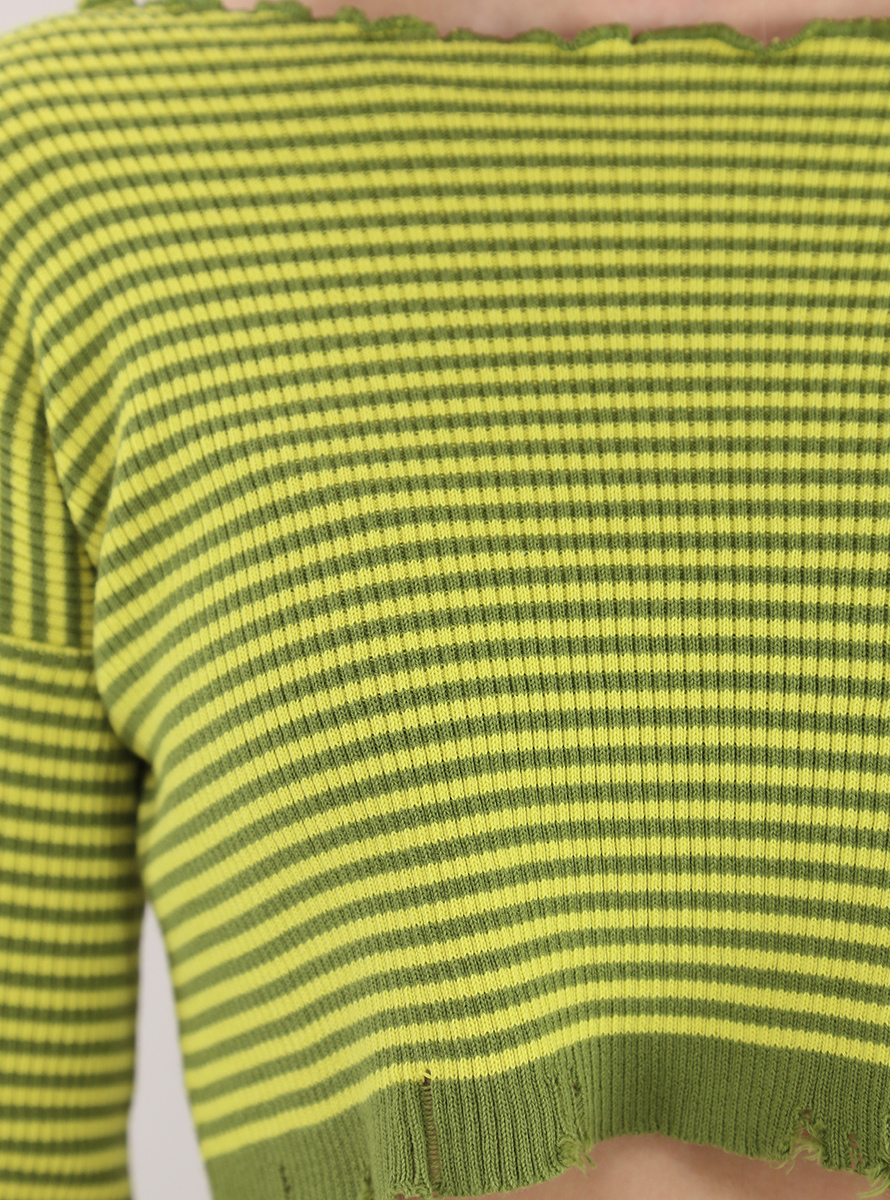 Aniye By Cropped-Pullover aus Baumwolle. Weite und lange Ärmel. Rundhals. Abgenutzte Mittel. Zweifarbiges Streifenmuster. Das Model ist 1,74 cm groß und trägt Größe XS.