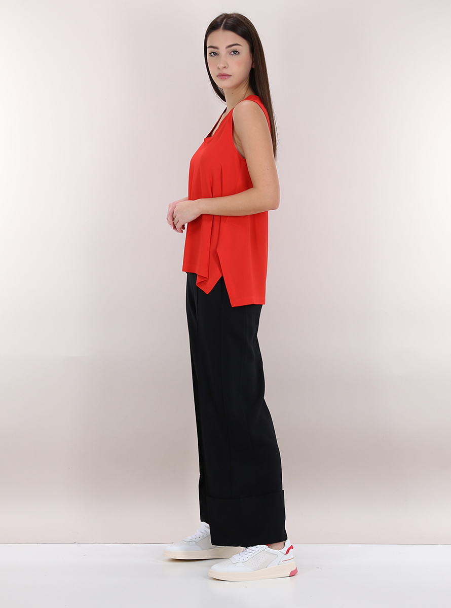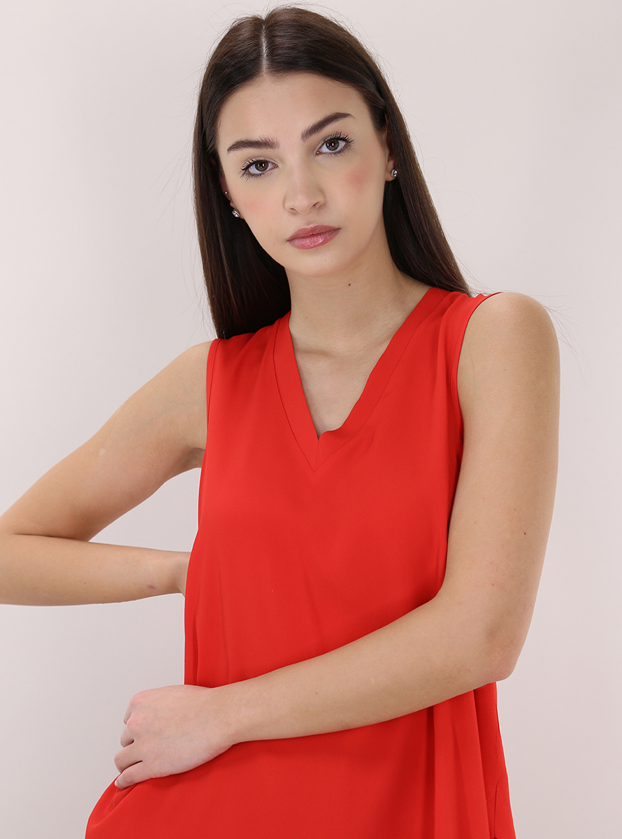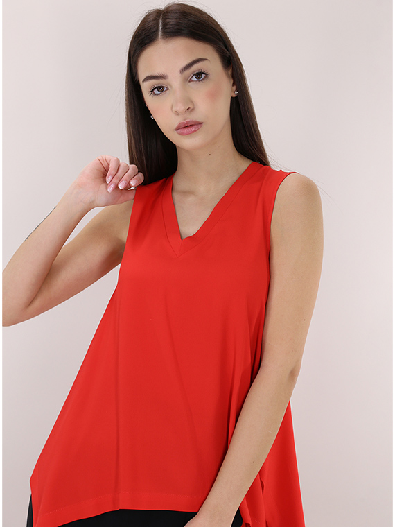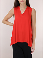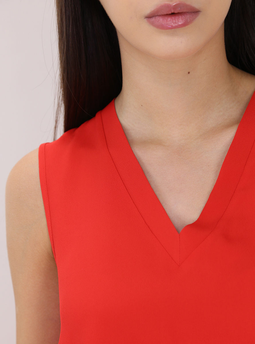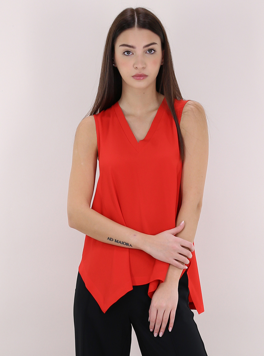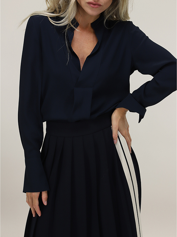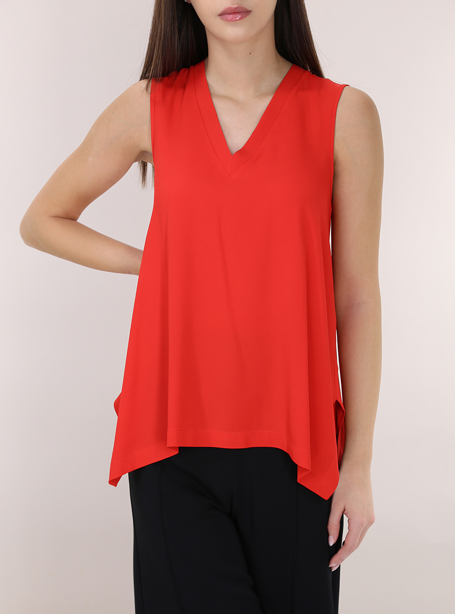 Beatrice B Top aus Seidenmischung mit V-Ausschnitt vorne. Ausgestellter Boden mit Schlitzen. Das Model ist 1,70 groß und trägt Größe 38.
