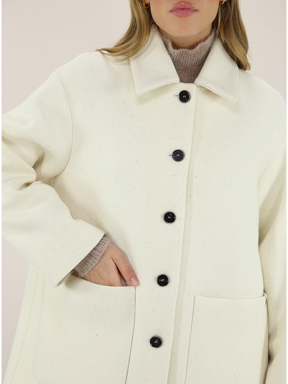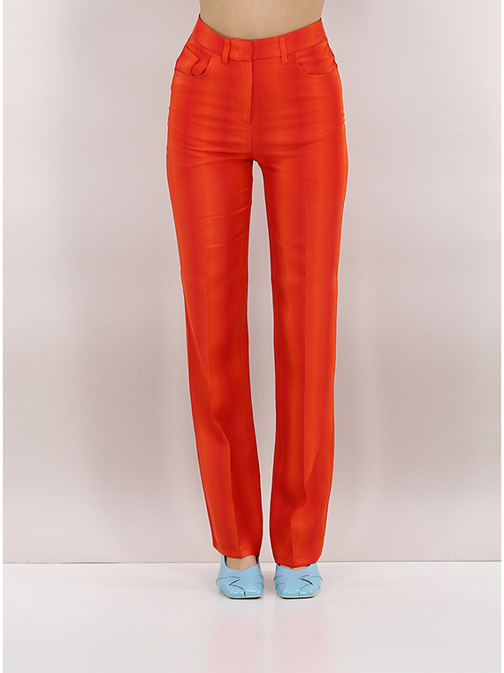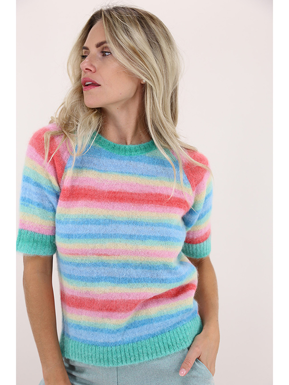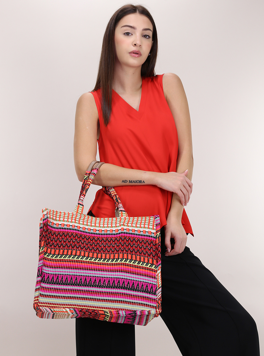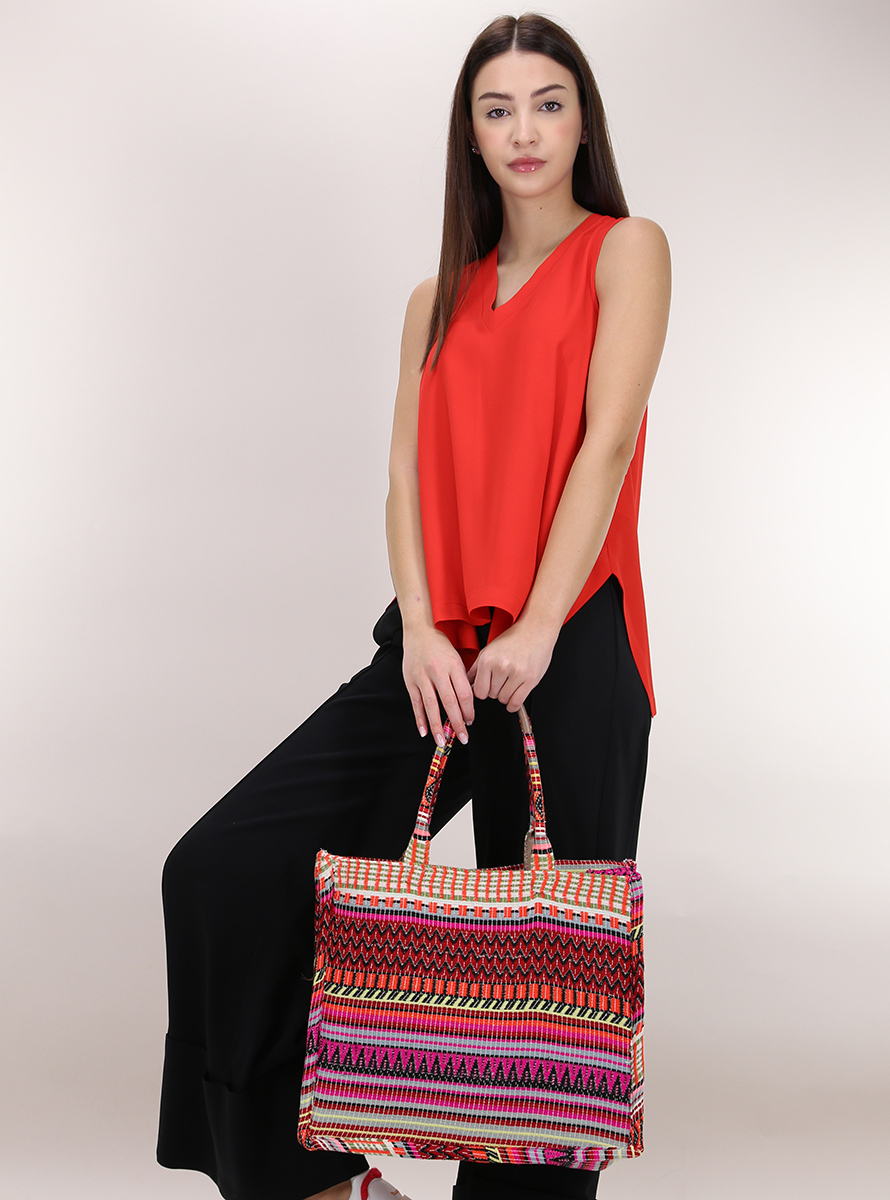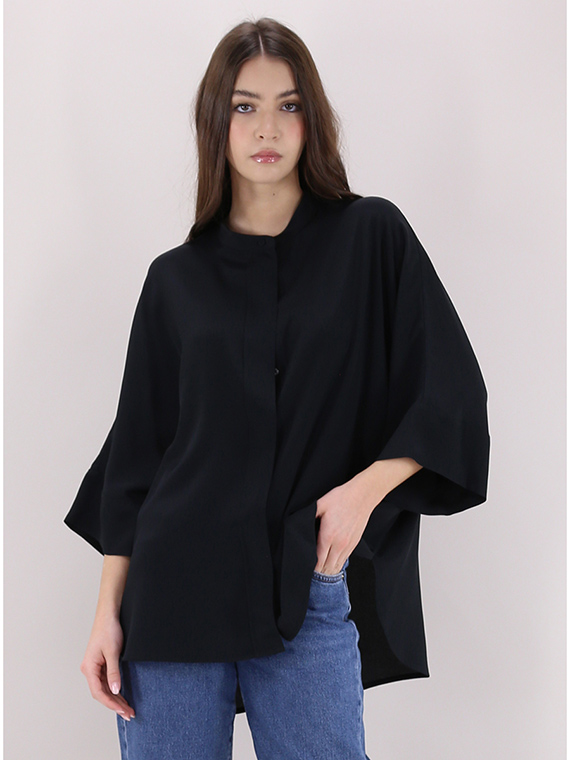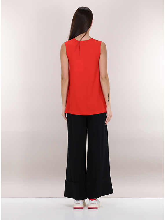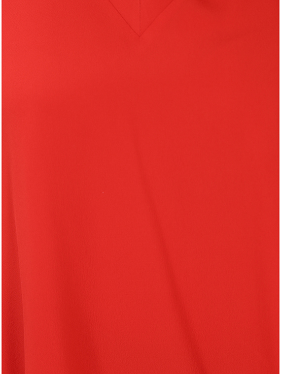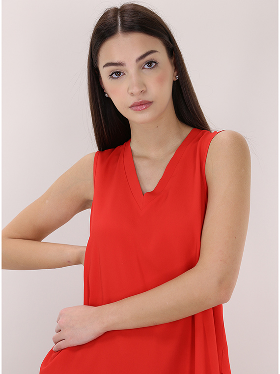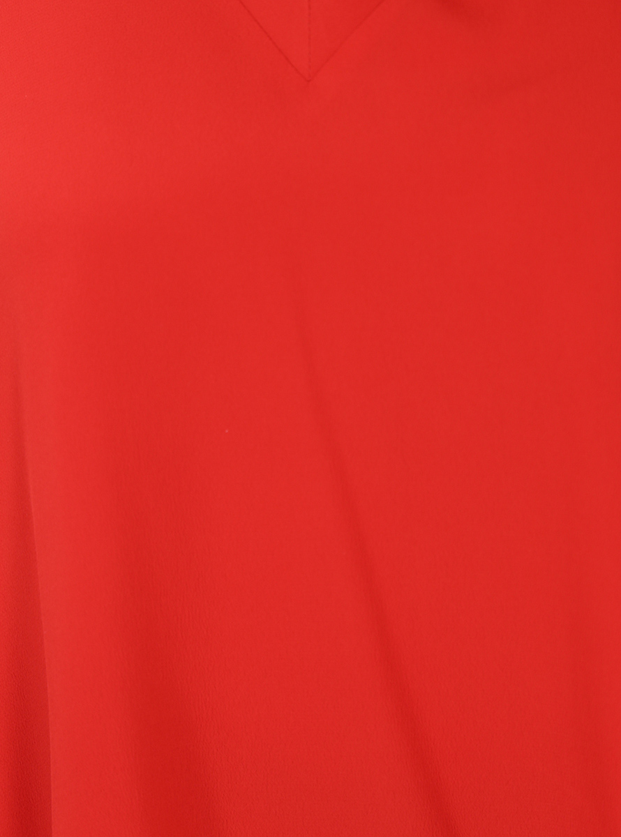 Beatrice B Top aus Seidenmischung mit V-Ausschnitt vorne. Ausgestellter Boden mit Schlitzen. Das Model ist 1,70 groß und trägt Größe 38.