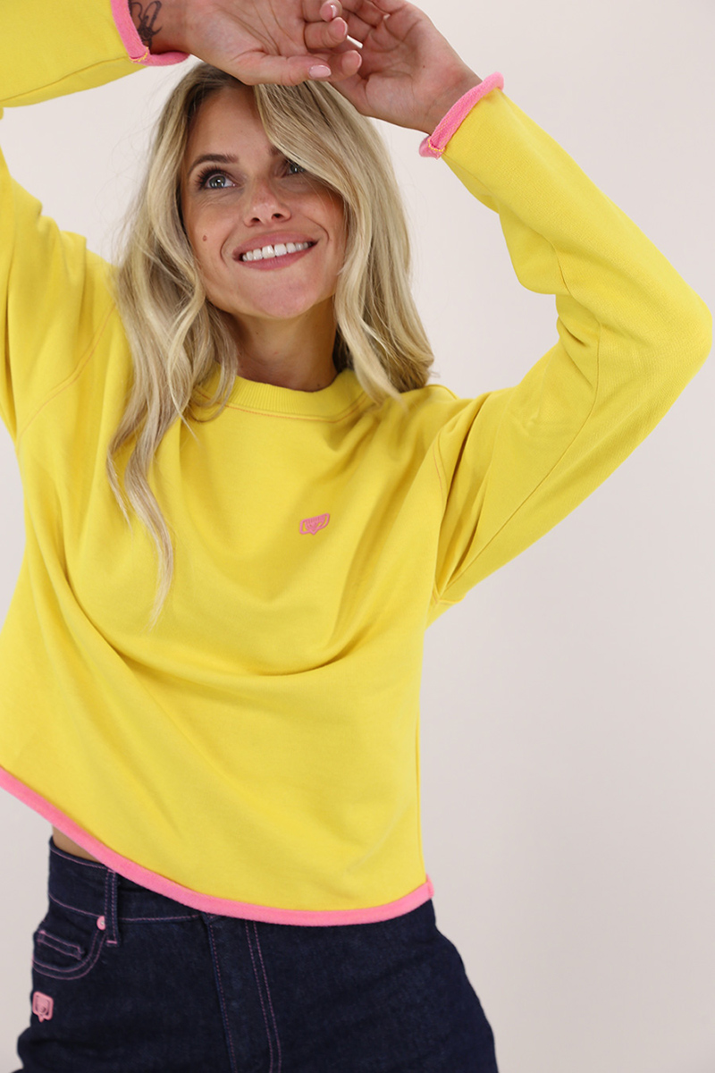 Chiara Ferragni zweifarbiger Pullover aus weicher Stretch-Baumwolle mit langen Ärmeln und Rundhalsausschnitt mit Bündchen. Kontrastierende, roh geschnittene Hosen. "I Like"-Logo auf der Vorderseite. Das Model ist 1,68 groß und trägt Größe XS.