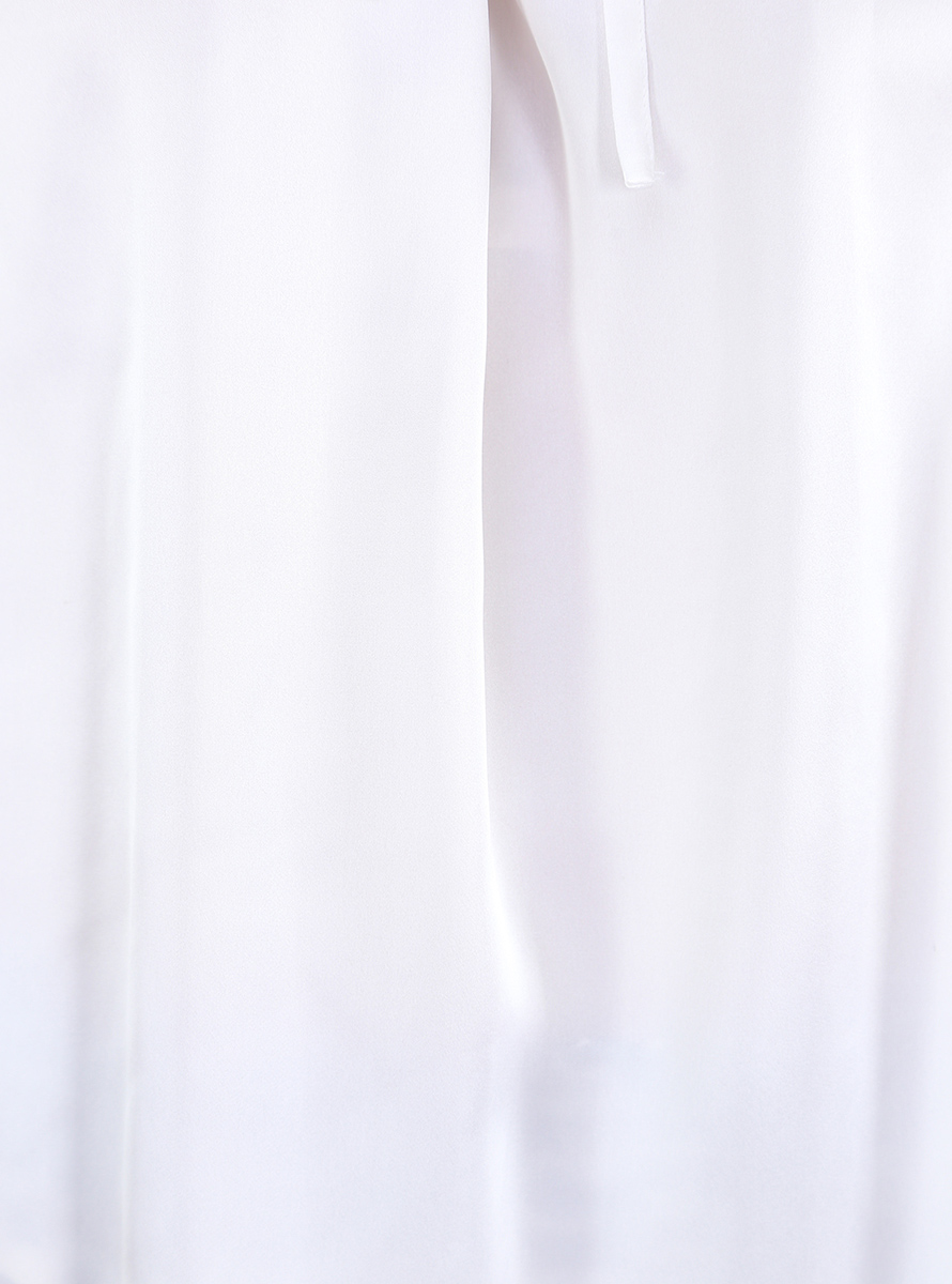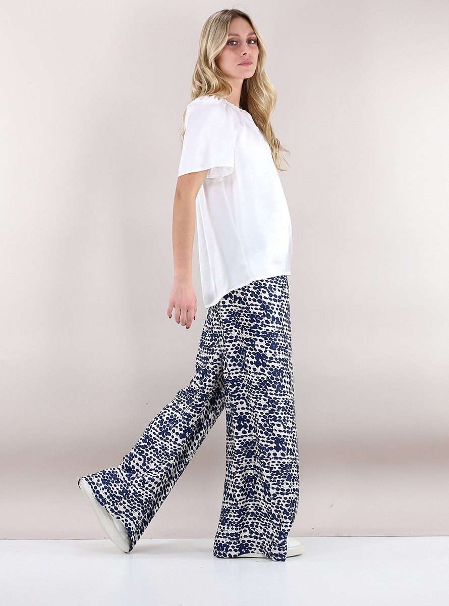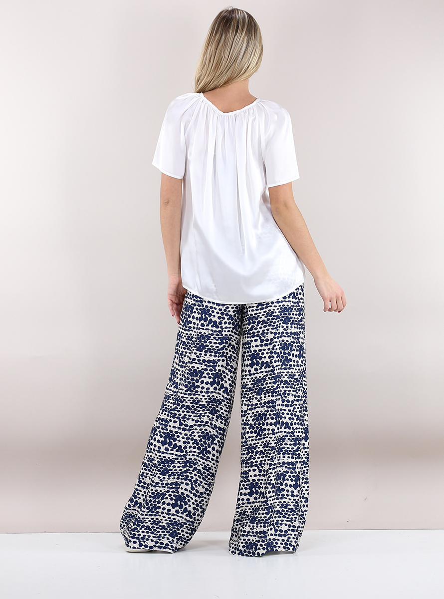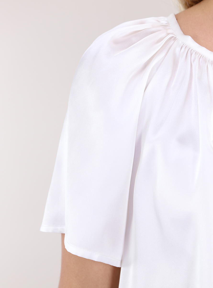 Manila Grace fließender Pullover aus Seidensatin mit kurzen Ärmeln und gerafftem Rundhalsausschnitt. Schnürverschluss vorne. Das Model ist 1,70 groß und trägt Größe 38.
