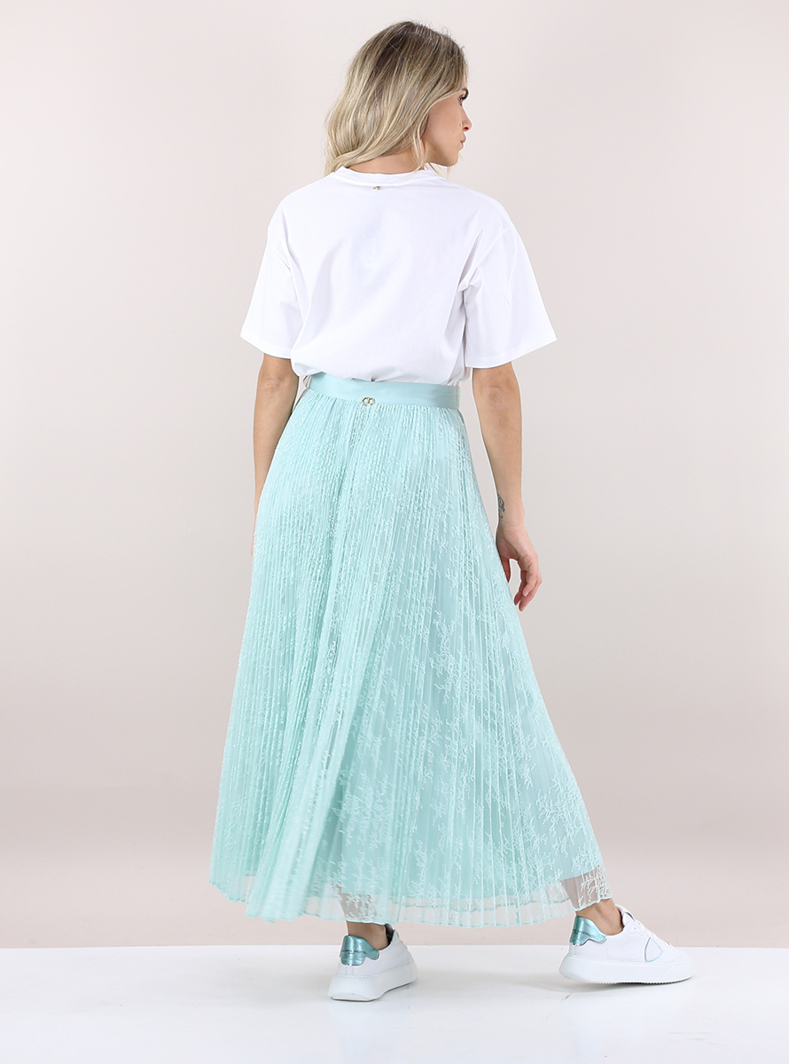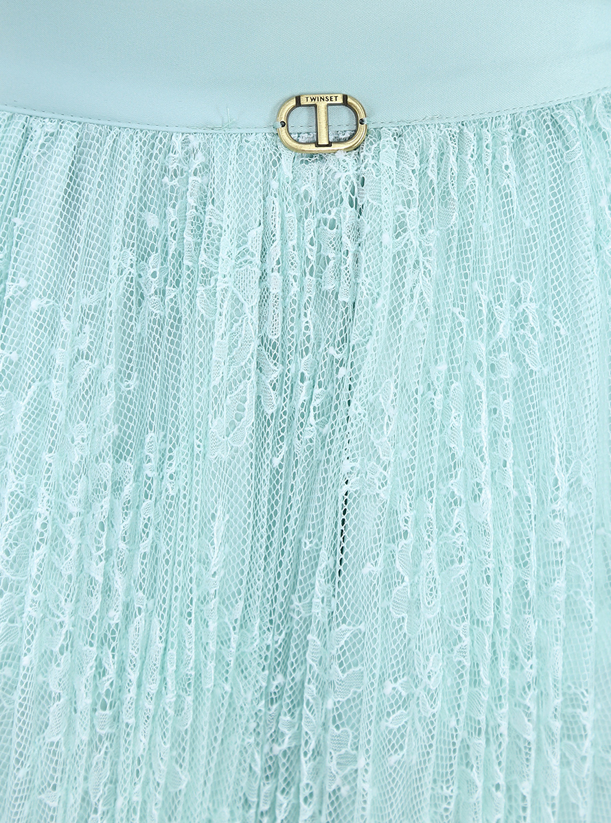 Twin Set Faltenrock aus gefütterter Spitze. Seitlicher Reißverschluss. Das Model ist 1,68 groß und trägt Größe 40.