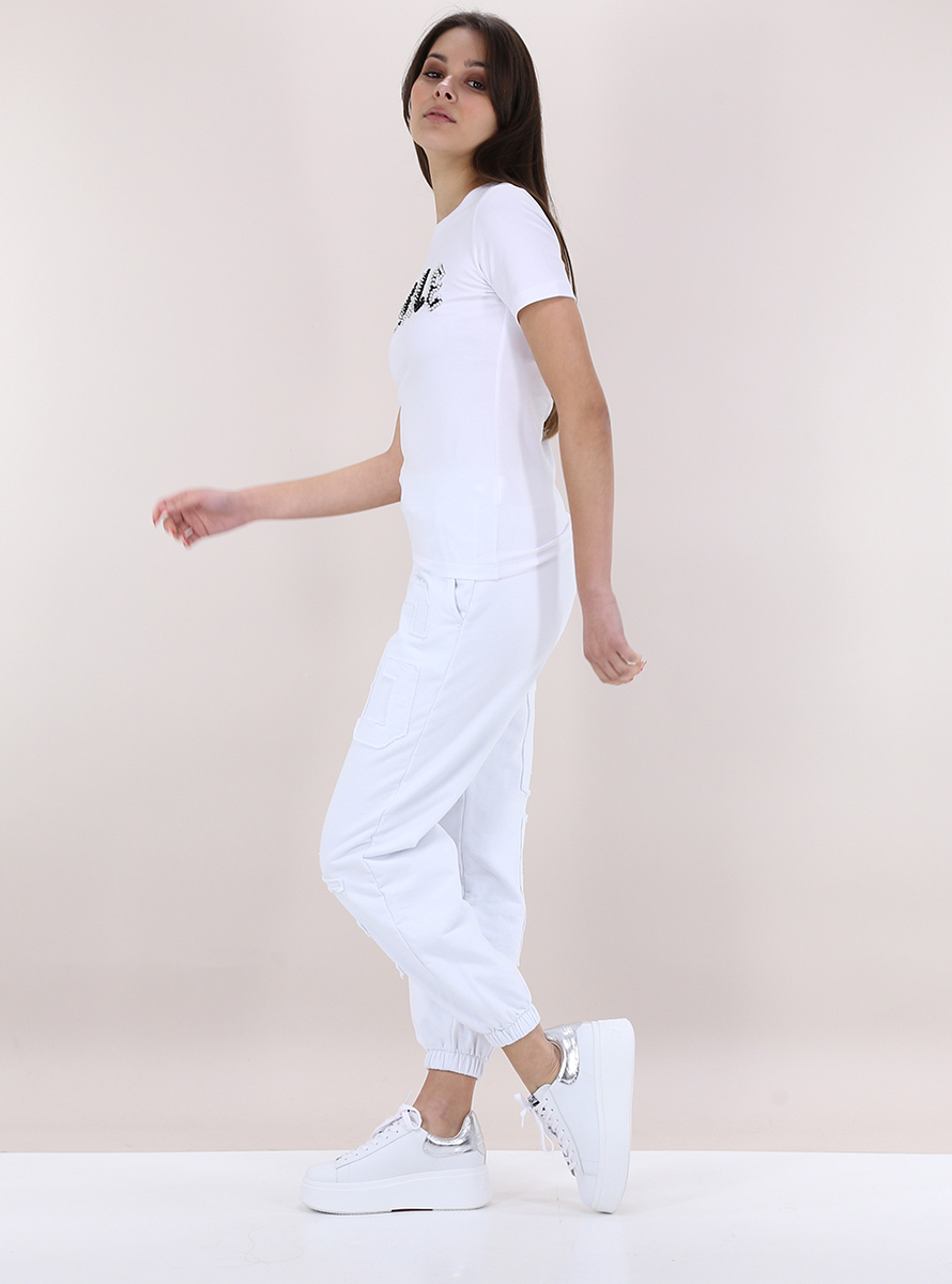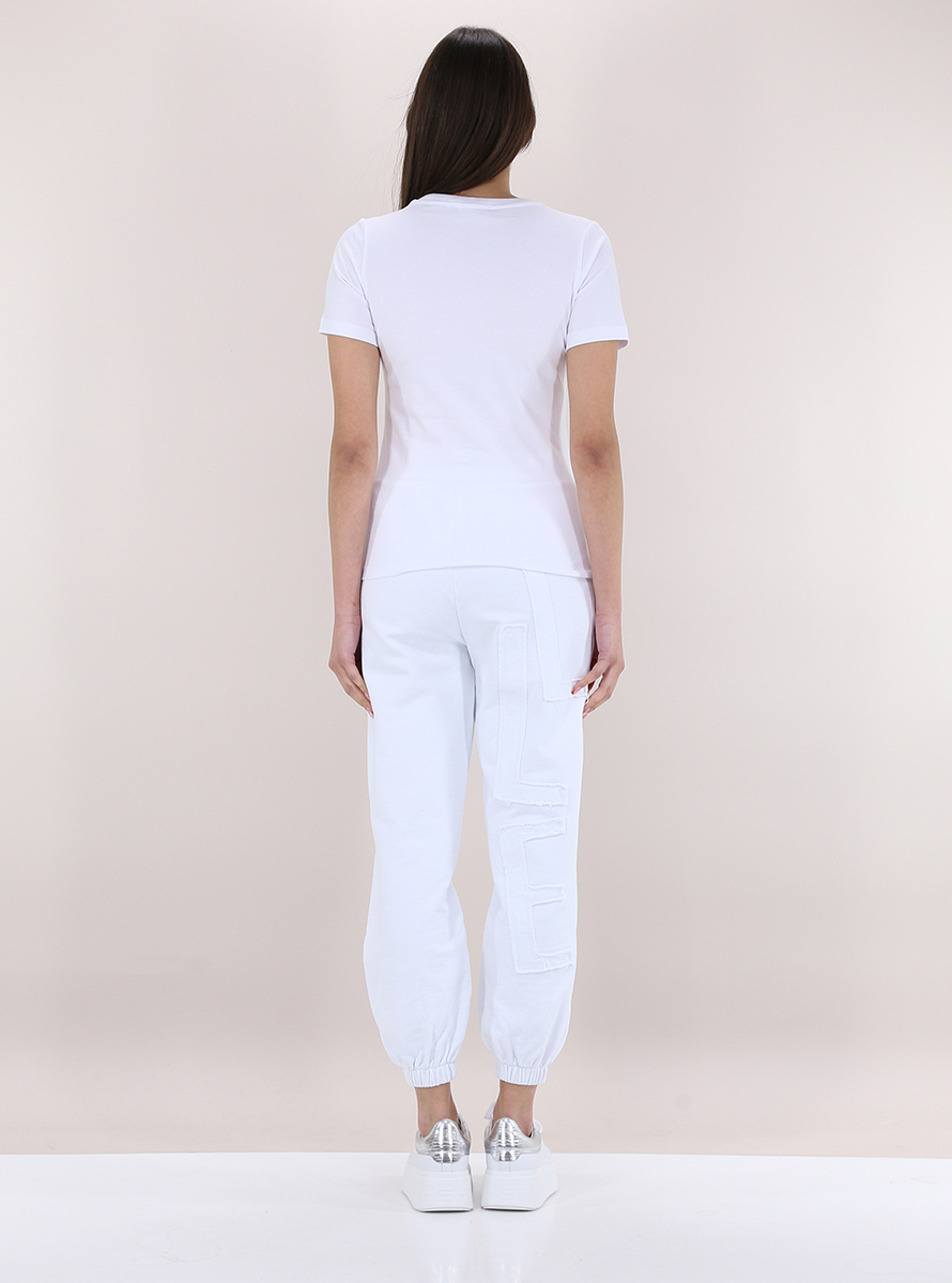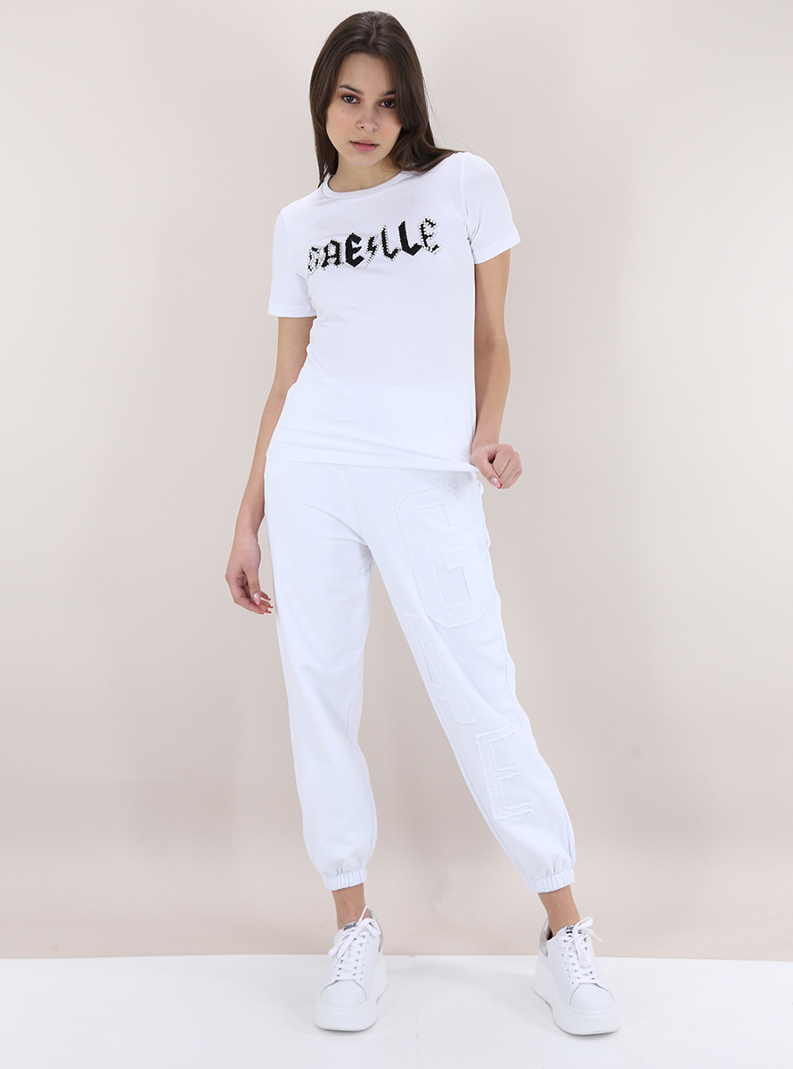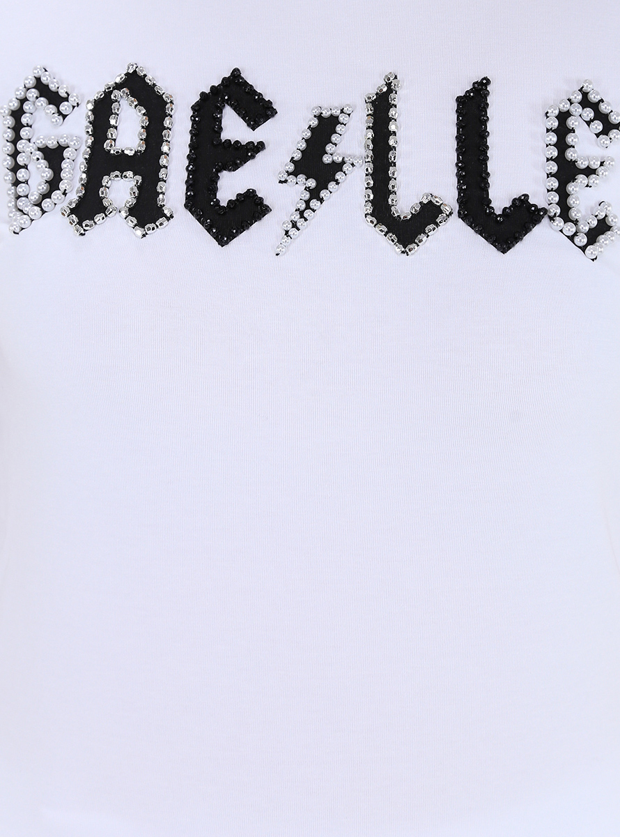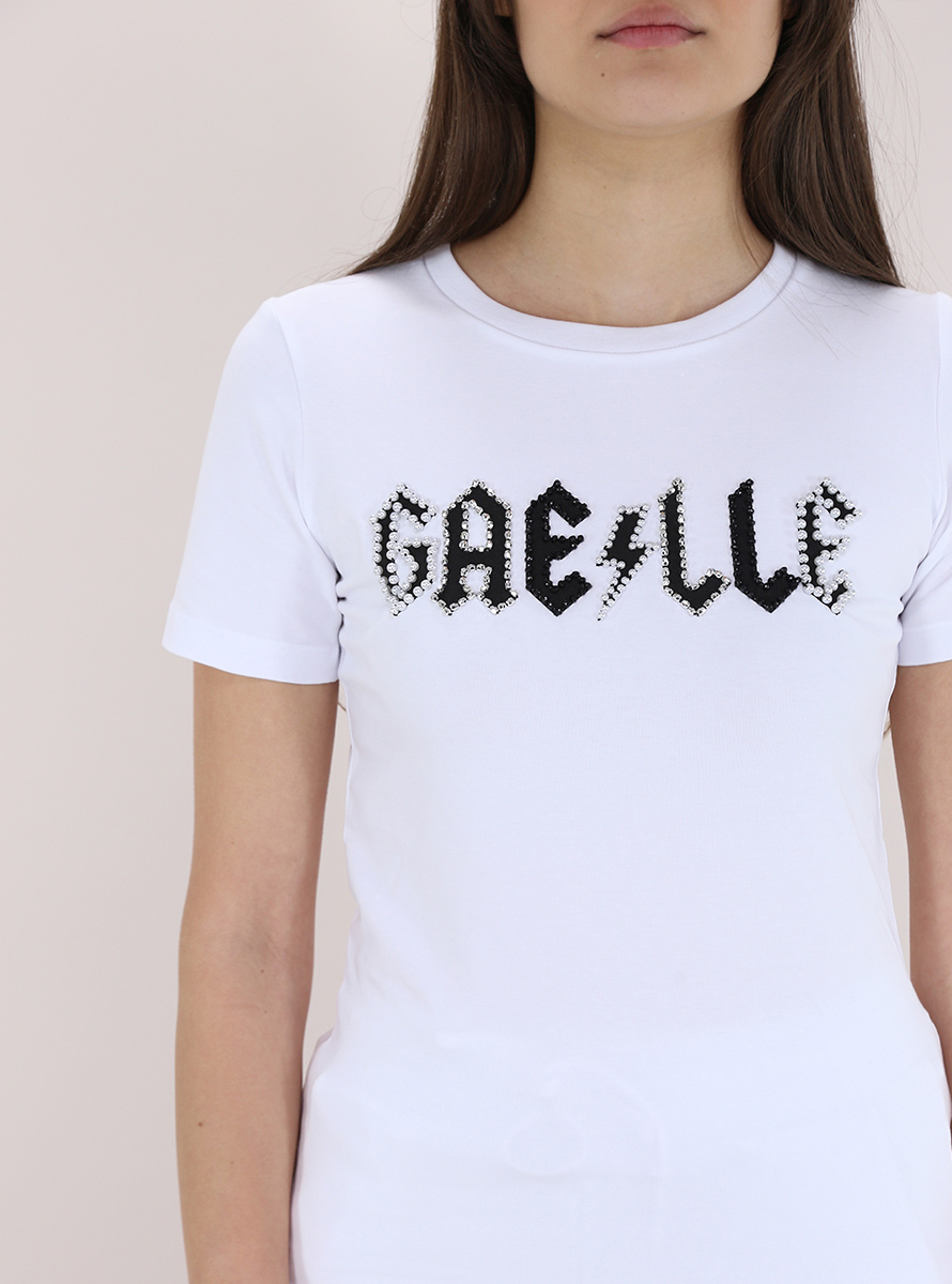 Gaelle Paris T-Shirt aus Baumwolle mit kurzen Ärmeln und Rundhalsausschnitt. Logodruck mit Strasssteinen. Das Model ist 1,75 groß und trägt Größe 40.