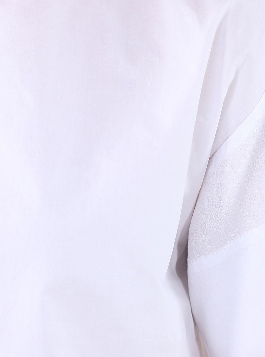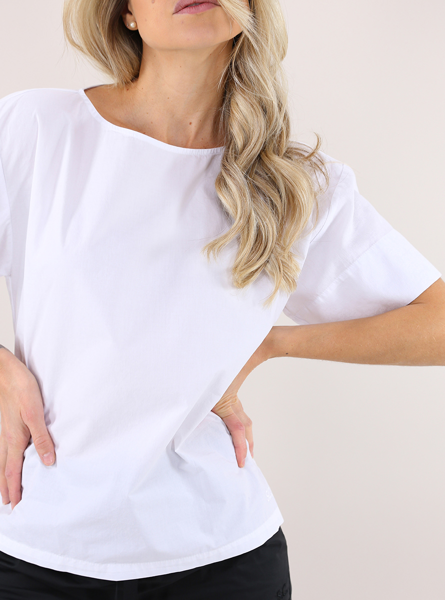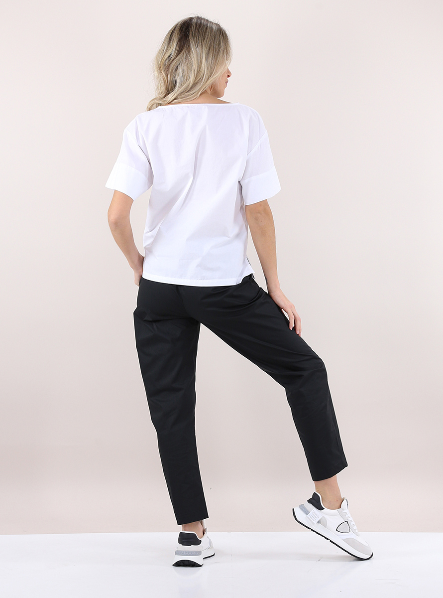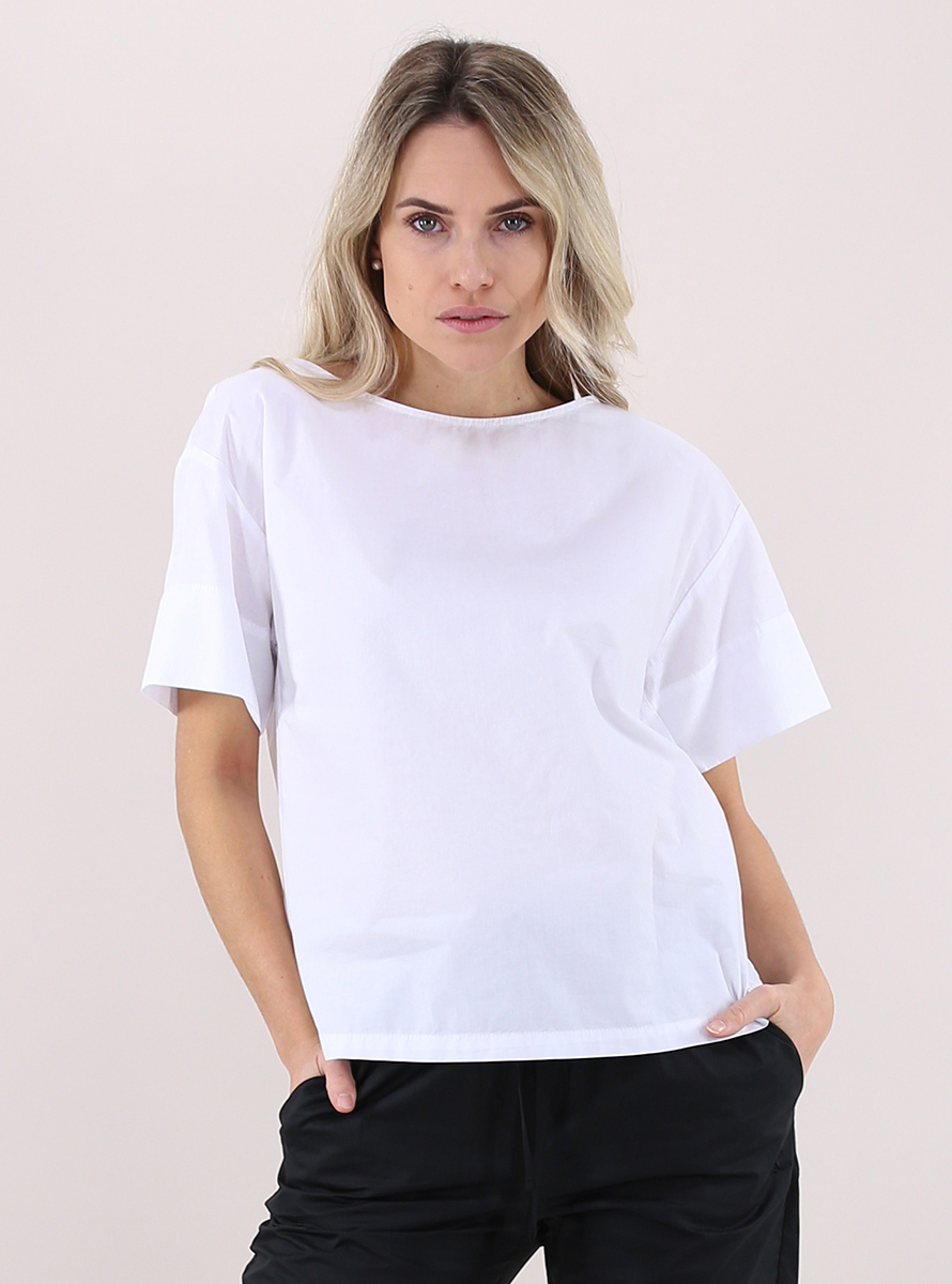 T-Shirt aus Semicouture-Baumwolle mit kurzen Ärmeln und Rundhalsausschnitt. Schlitze unten. Das Model ist 1,68 groß und trägt Größe 40.
