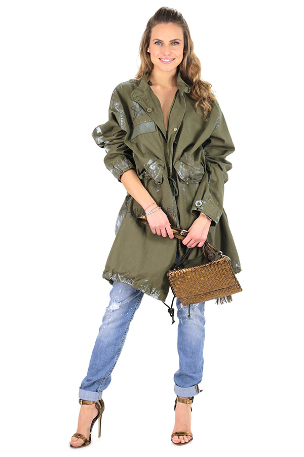 Parka vintage militare, scritte sulla parte frontale e dipinto a mano sul retro. La modella è alta 1,68 ed indossa la taglia unica.