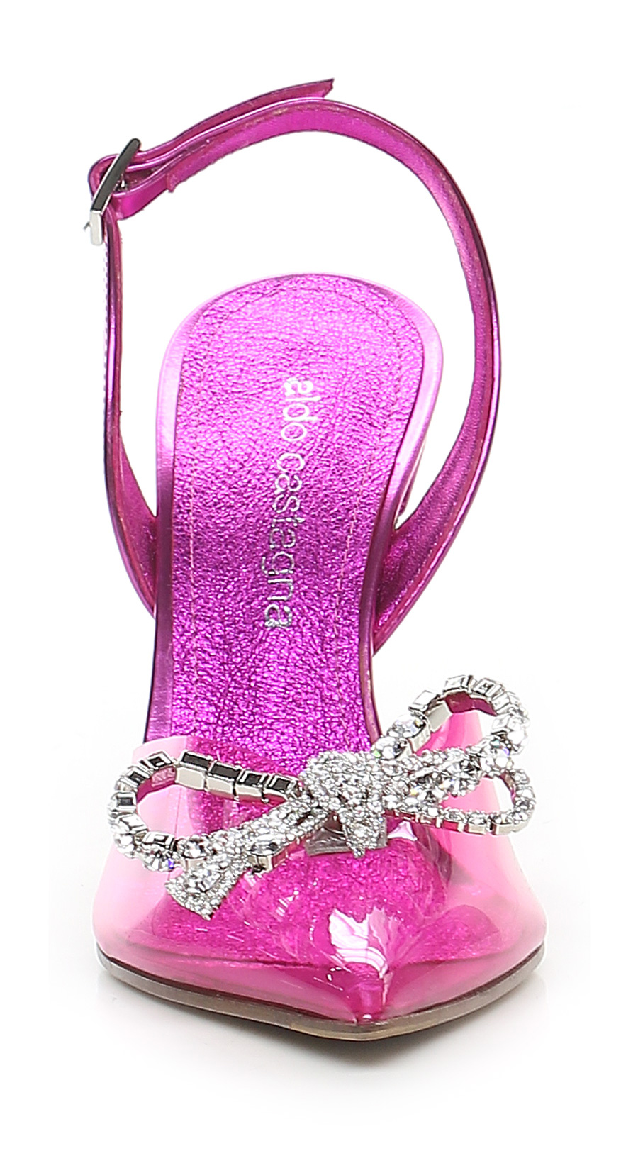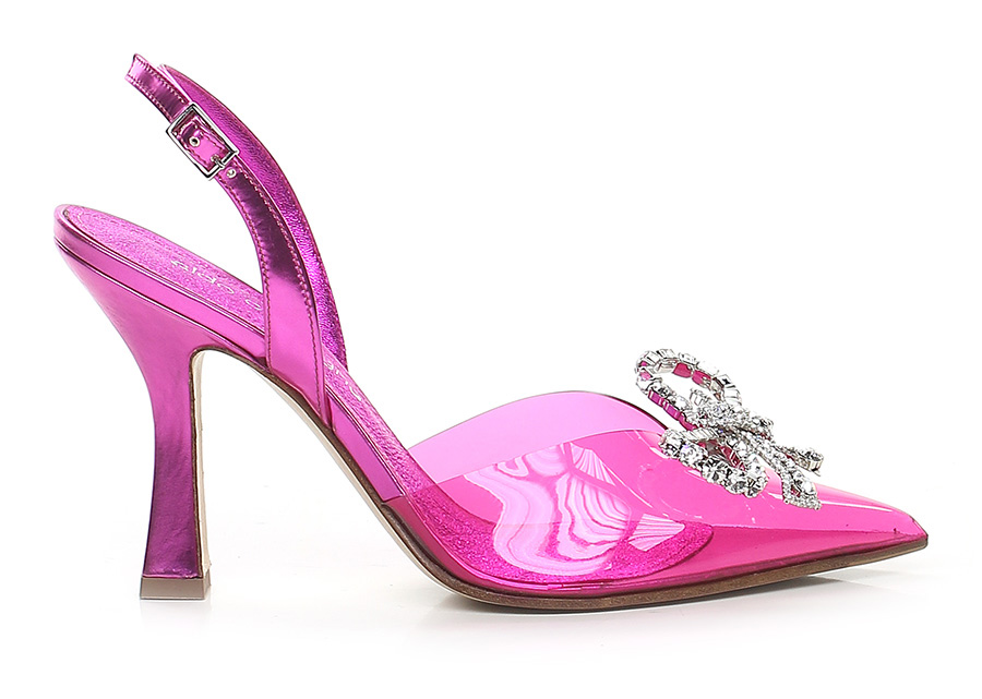 Schuh aus verspiegeltem Leder und PVC mit Riemen auf der Rückseite. Schleifenzubehör mit Strasssteinen vorne. Sohle aus Leder und Gummi. 95mm Absatz.