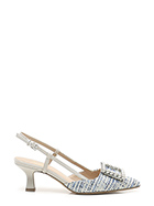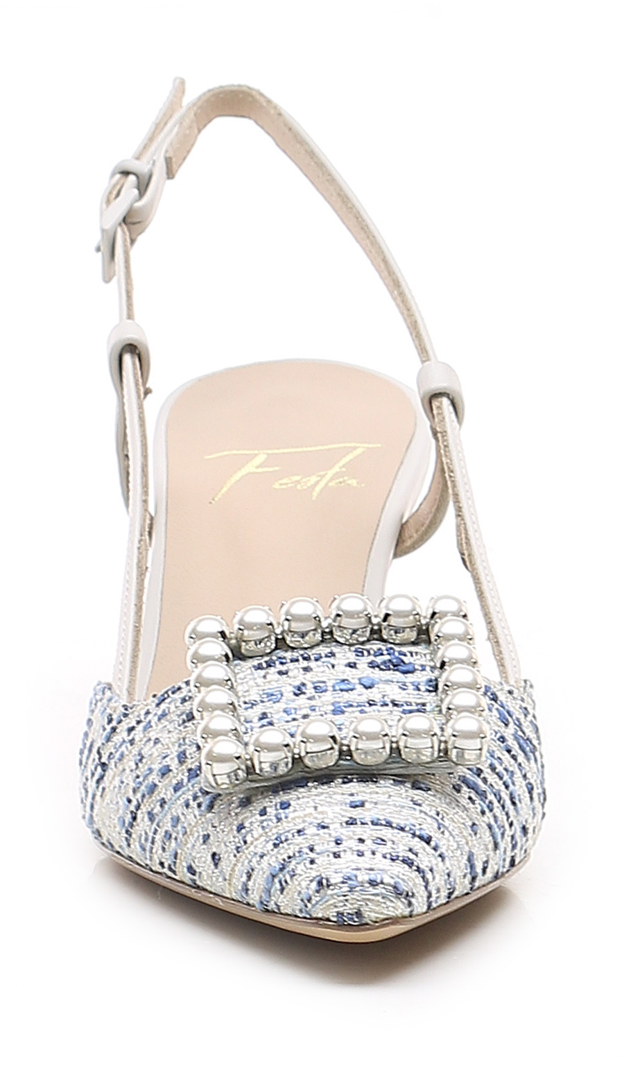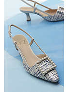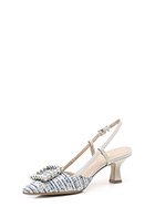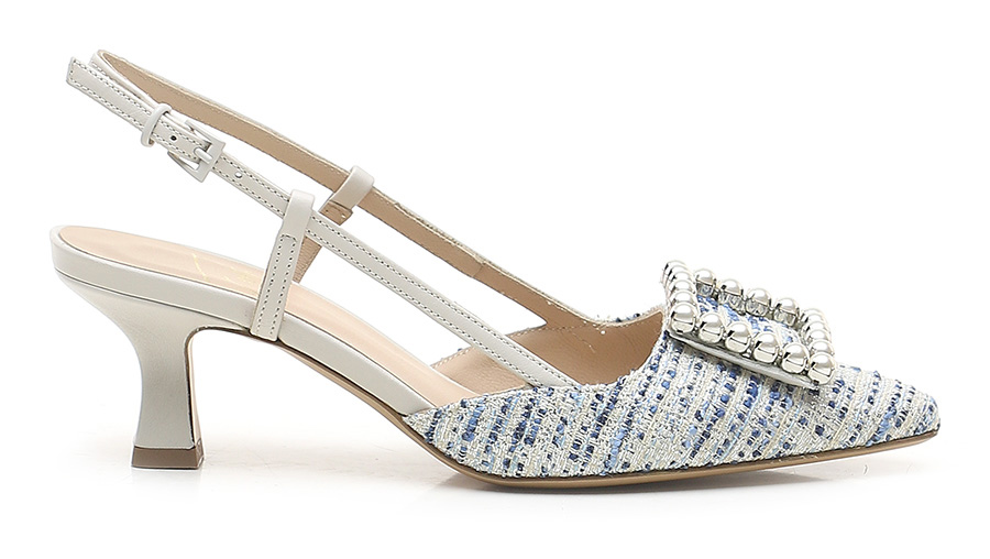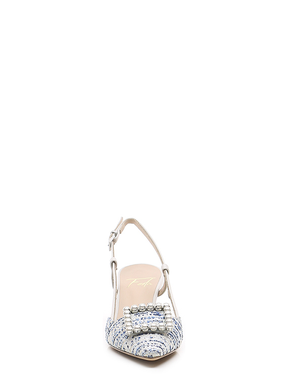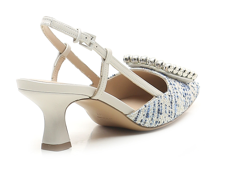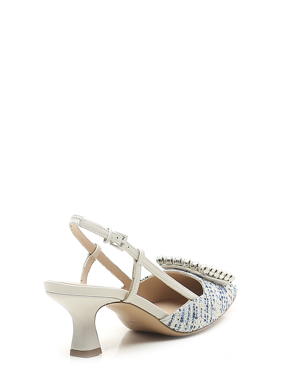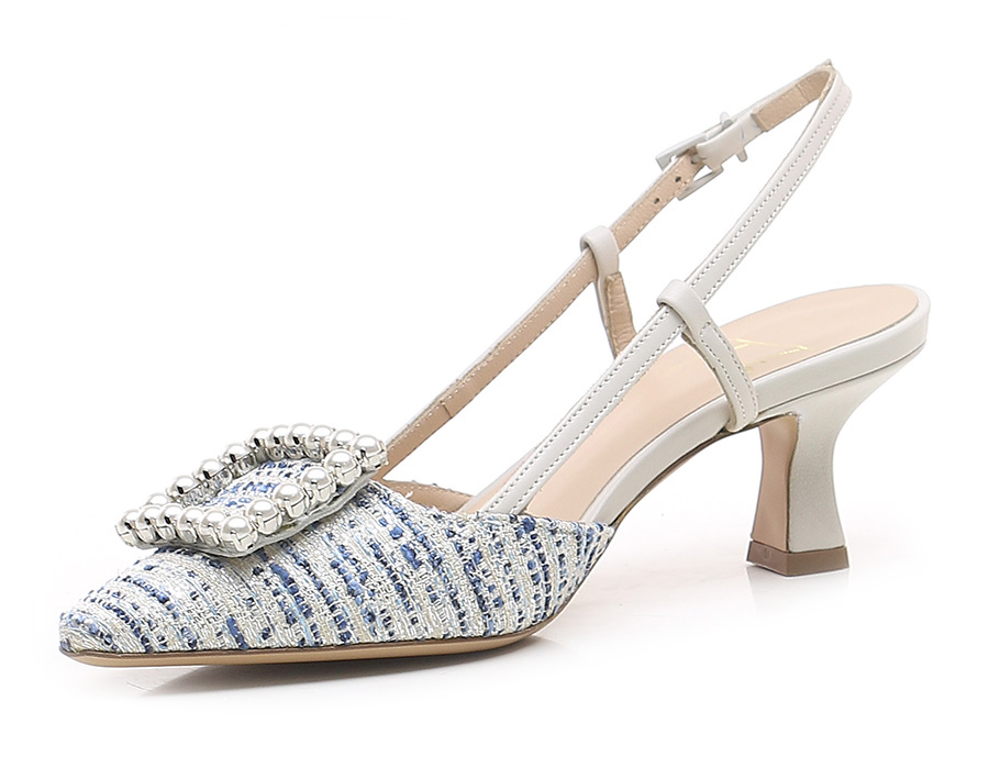 Schuh aus Stoff und Leder mit Riemen auf der Rückseite und Front-Accessoire mit Perlen. Ledersohle. Absatzhöhe 65mm.