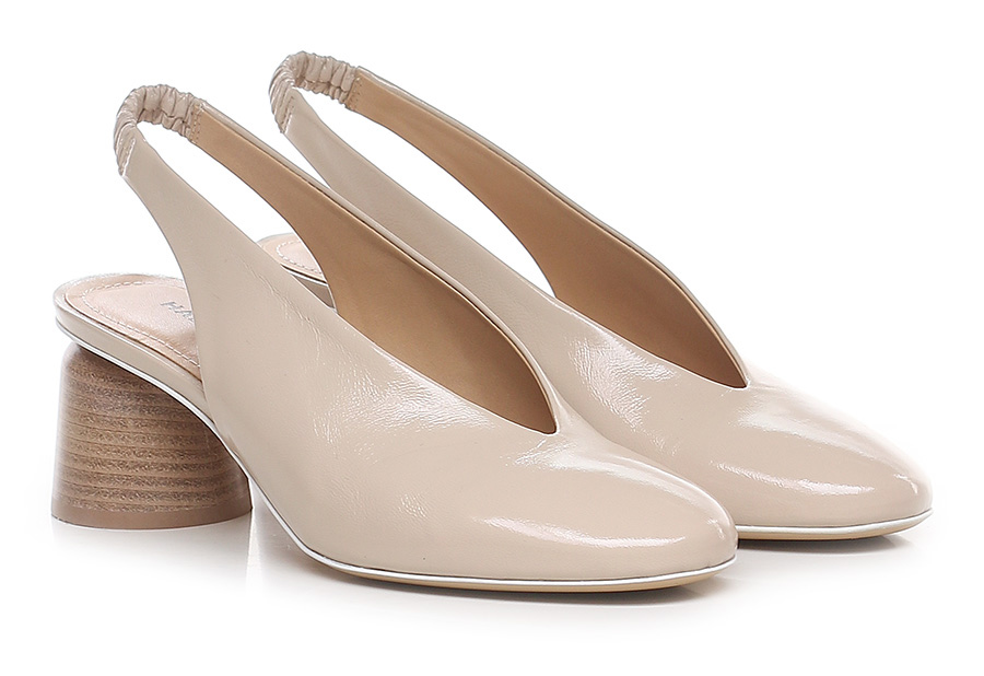 Lederschuh mit elastischem Rückenriemen. Sohle aus Leder und Gummi. Absatzhöhe 65mm. Absatz in Holzoptik.