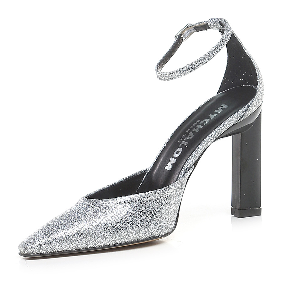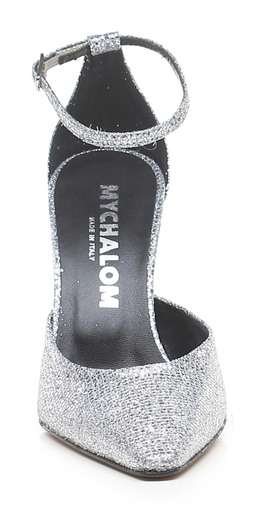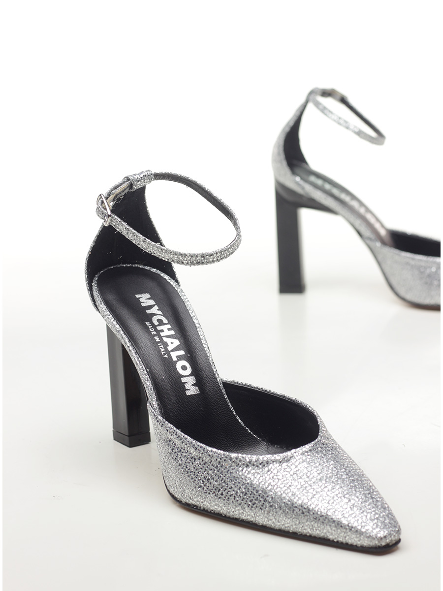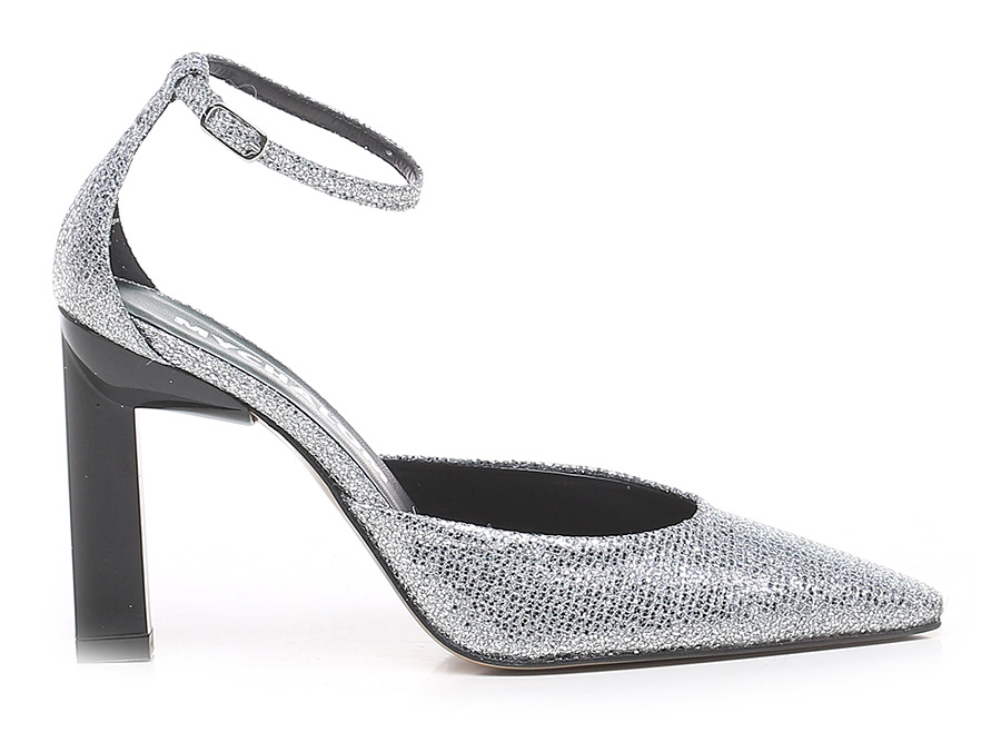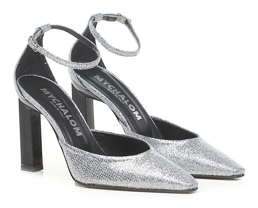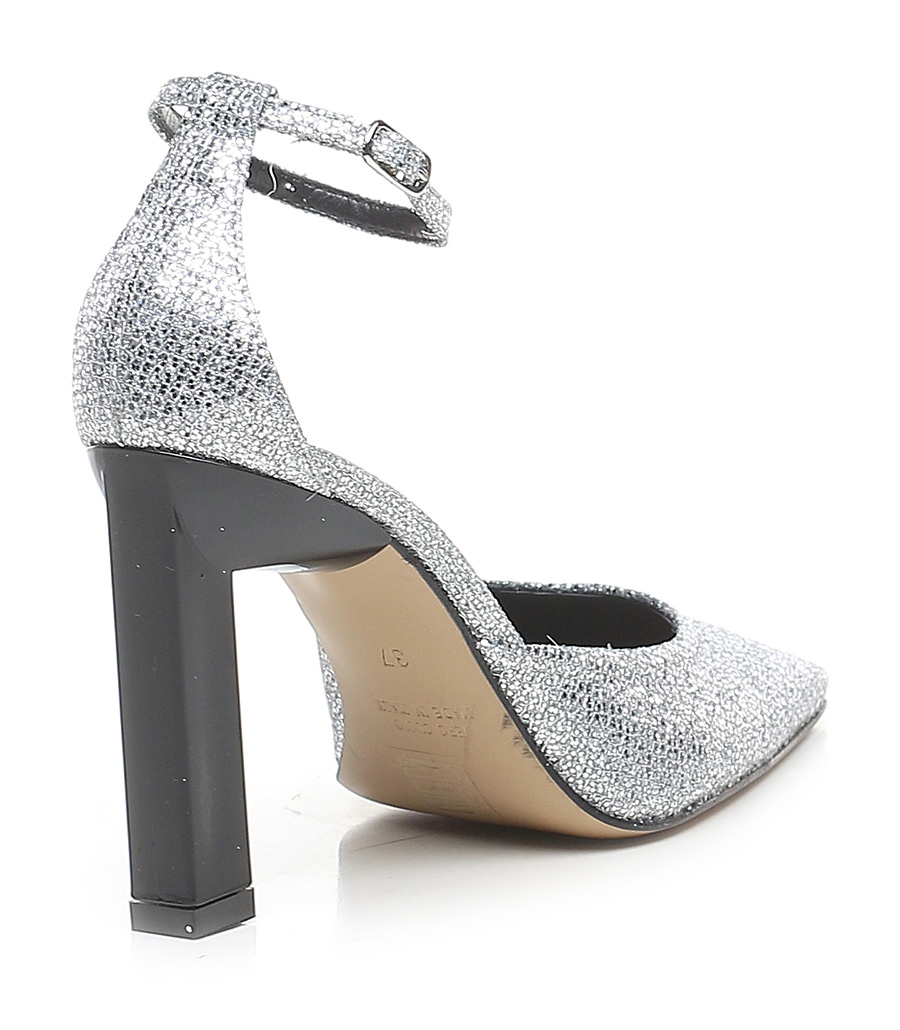Glitzerschuh mit Fesselriemchen und Ledersohle. Absatzhöhe 95mm. Absatz aus glänzendem PVC.