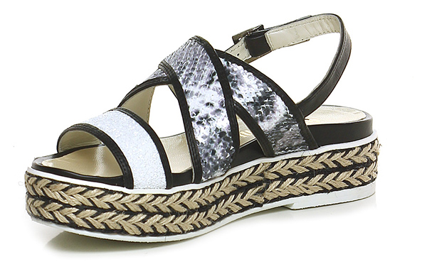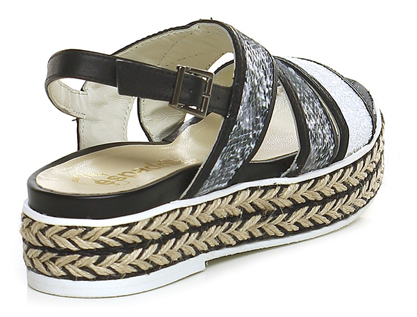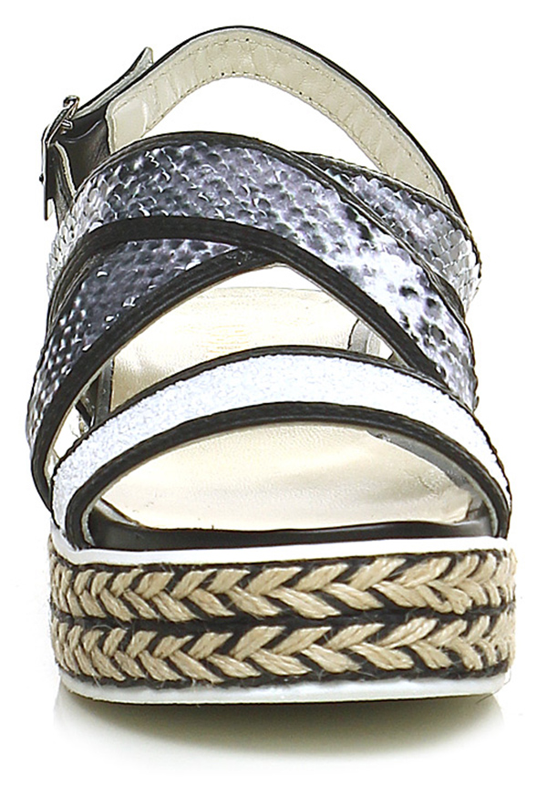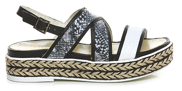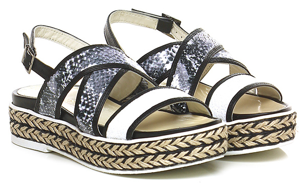 Niedrige Sandale aus Leder mit Python-Print, Glitzer und Leder mit Riemen auf der Rückseite und Gummisohle. 50 Absatz, 40 Plateau mit 10 bar.