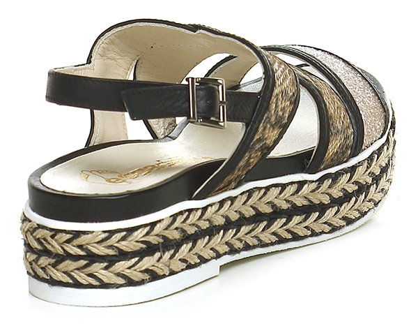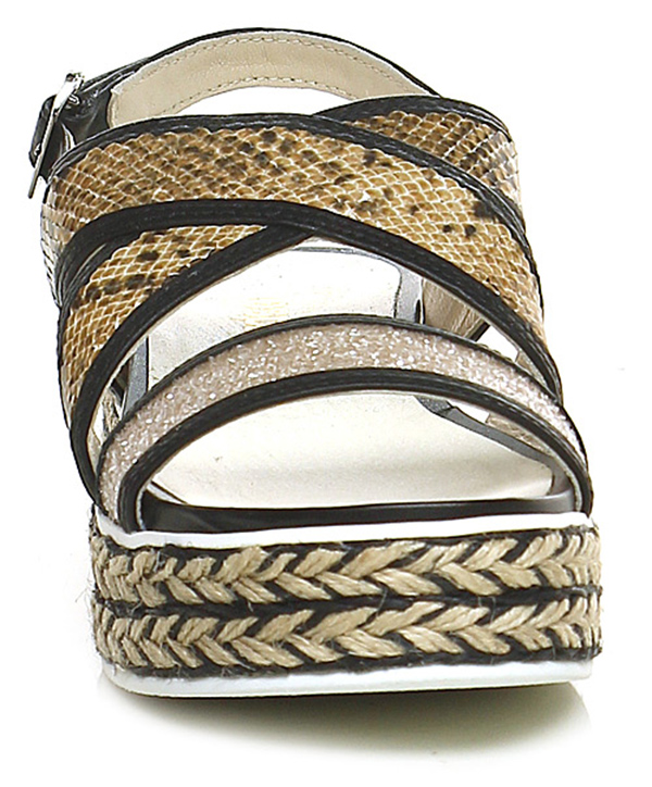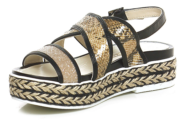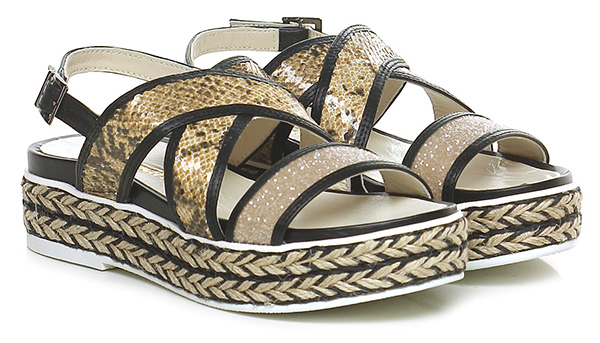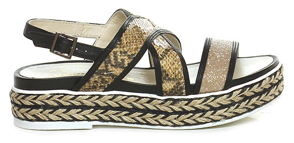 Niedrige Sandale aus Leder mit Python-Print, Glitzer und Leder mit Riemen auf der Rückseite und Gummisohle. 50 Absatz, 40 Plateau mit 10 bar.