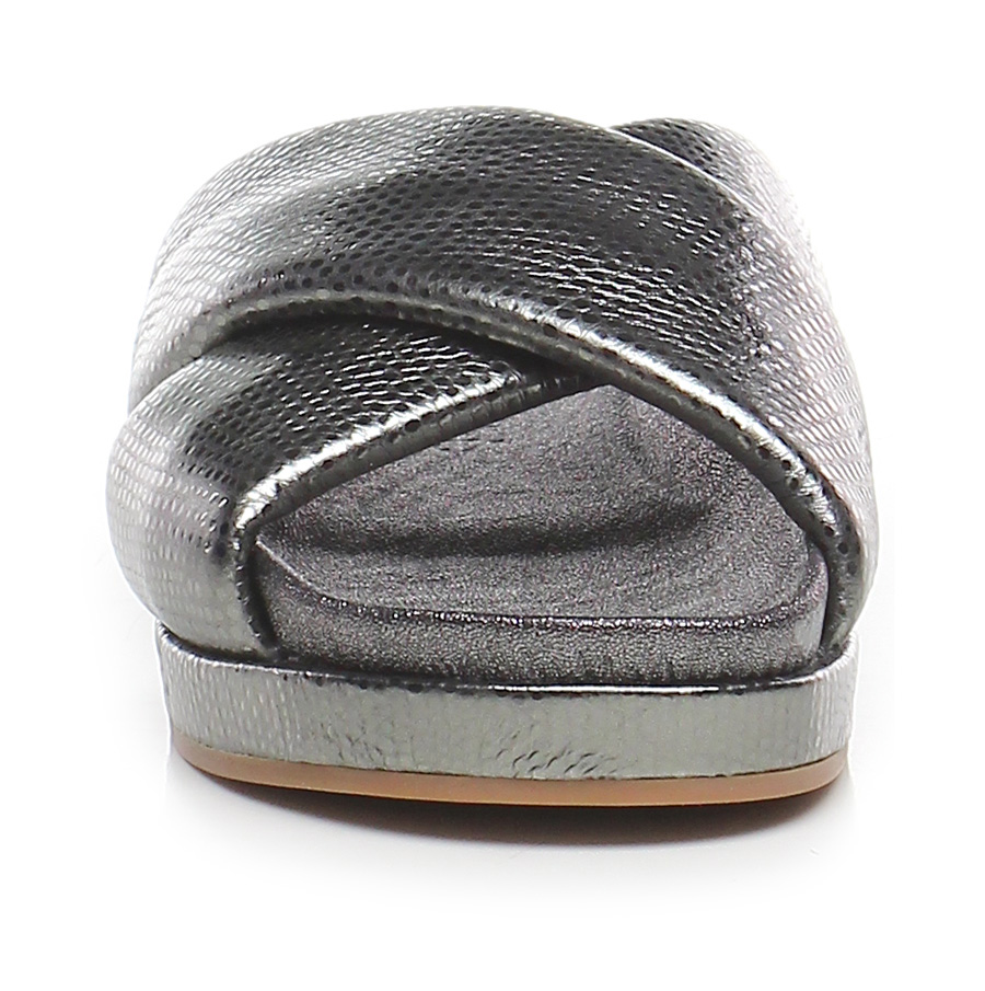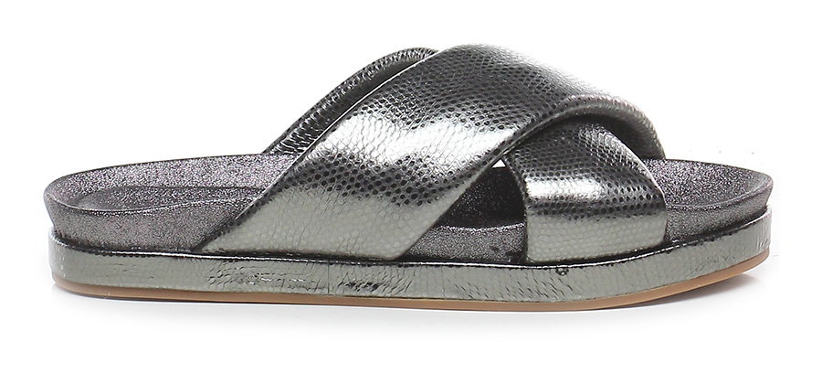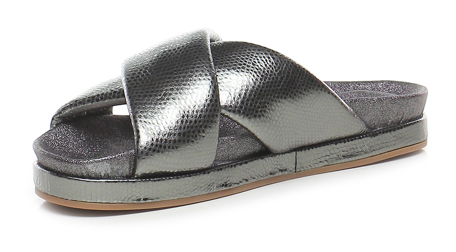 Flache Sandale aus laminiertem Leder mit Python-Print, Gummisohle. Absatz 30, Plateau 25 mit Absatz 5. Keil mit Leder überzogen. Fussbet-Sohle.