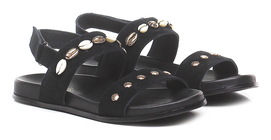 Niedrige Wildledersandale mit kontrastierenden Applikationen aus natürlichen und metallischen Muscheln auf dem Obermaterial, Klettverschluss auf der Rückseite. Gummisohle. Absatz 20, Plattform 15 mit Stange 5.