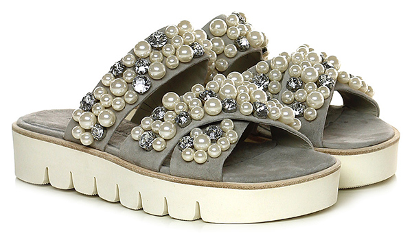 Sandalo basso in camoscio con perle e pietre su tomaia. Suola in gomma, tacco 40.